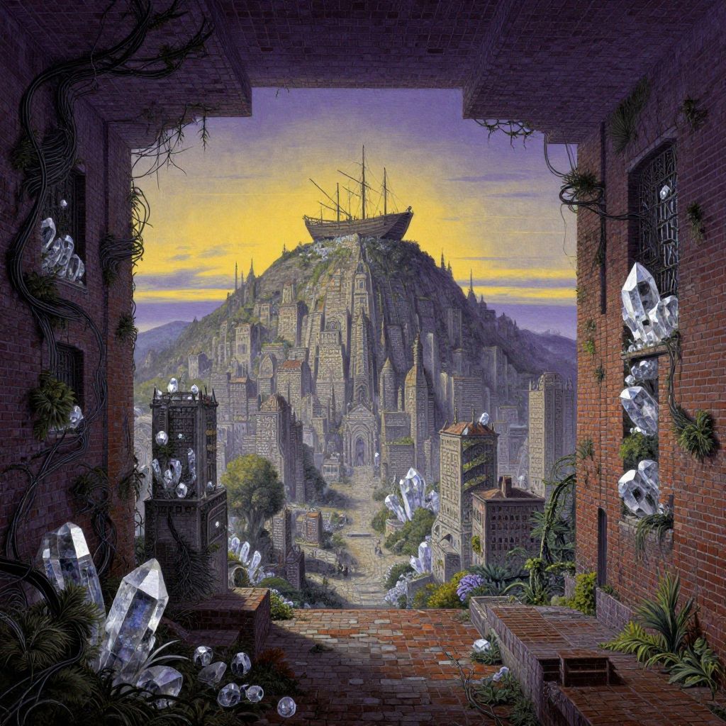 A landscape overcome with beauty, wonder, and magic. A masterpiece unlike anything the human mind could envision., by Wayne Reynolds and Charles Monet and Gustave dore epic, elven city, boat at the top of the hill, imagery, stoneham horror, dramatic dusk, deep purple yellow, brick brick wall, ceiling, bricks, overgrown streets, shau, walls made of crystals, pipe brambles and wires, vibrant vegetation, brutalism, fantasy, by Tyler Edlin, zdzislaw beksinski painting, cgsociety, artstation, by craig mullins, by greg rutkowski, by Thomas Kincade, octane render, nvidia, polaroid style, filmic, 1920s, cinematic lighting, 4k HDR, polaroid photography, daguerreotype, artstation trending on artstation hq, bokeh, clean clear details, sharp focus John Singer katz, clean and detailed, intricate, (lifelike:1.07), award-W 1024x10k HDR, very coherent symmetrical, daily deviation, elegant, highly detailed, very coherent, hyperreal, HD Quality, artgem, hypermaximalist, dark theme wow, masterpiece, intricate details
