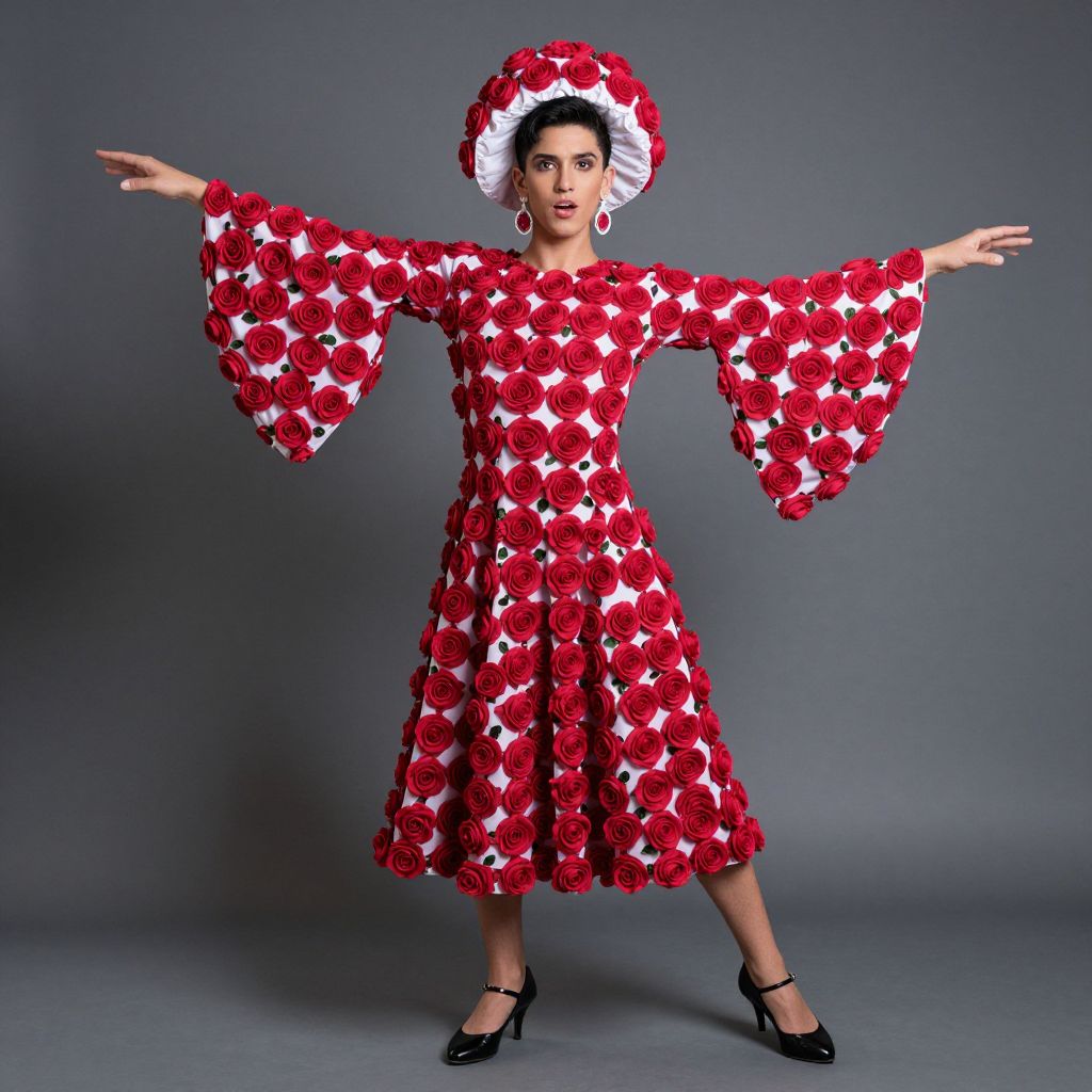 Spanish rose dance costume, solo, dress, hat, male focus, 1boy, crossdressing, black hair, full body, earrings, standing, flower, high heels, parody, wide sleeves