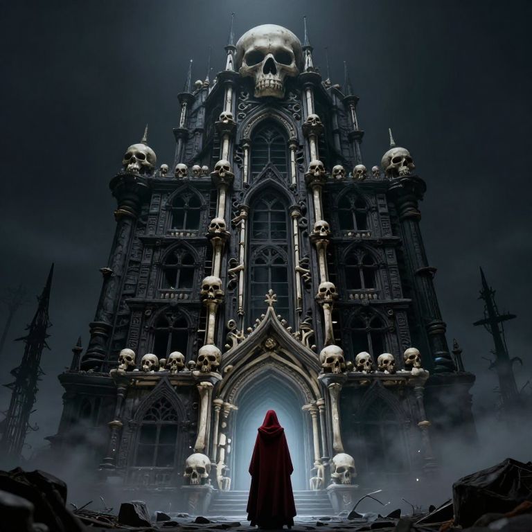 Digital Design a tall dark building made of skulls and bones, dark mystic atmosphere, mist and lighting, a mysterious figure standing in front of the building wearing a red cloak,