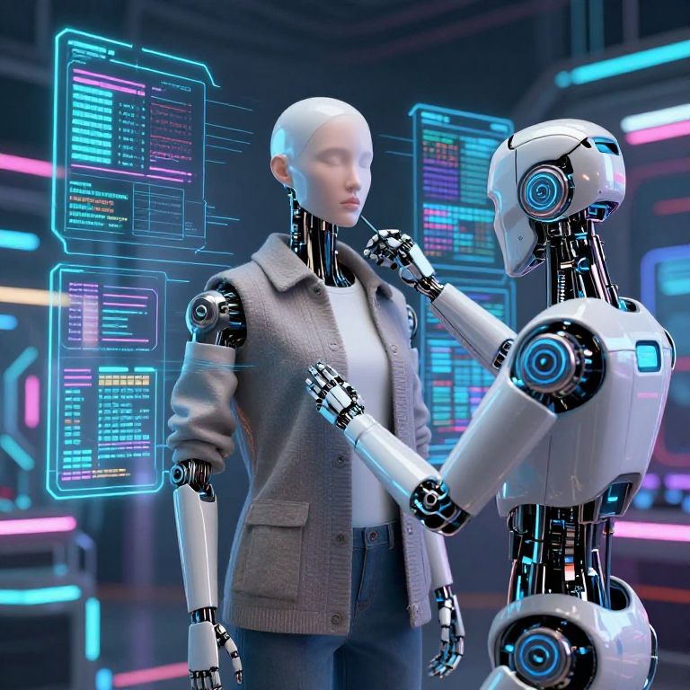 Photograph of a futuristic scene featuring two humanoid robots with white, glossy, and metallic bodies. The standing robot, with a bald head, wears a gray, textured blazer over a white shirt. The other robot, with its right hand on the standing robot's shoulder, has a similar design. Both robots have blue glowing eyes and joints. Neon blue and pink holographic displays float around them, showing code and data. The background is a dark, futuristic lab with illuminated panels and equipment, creating a high-tech atmosphere. The image has a sci-fi, cybernetic aesthetic.