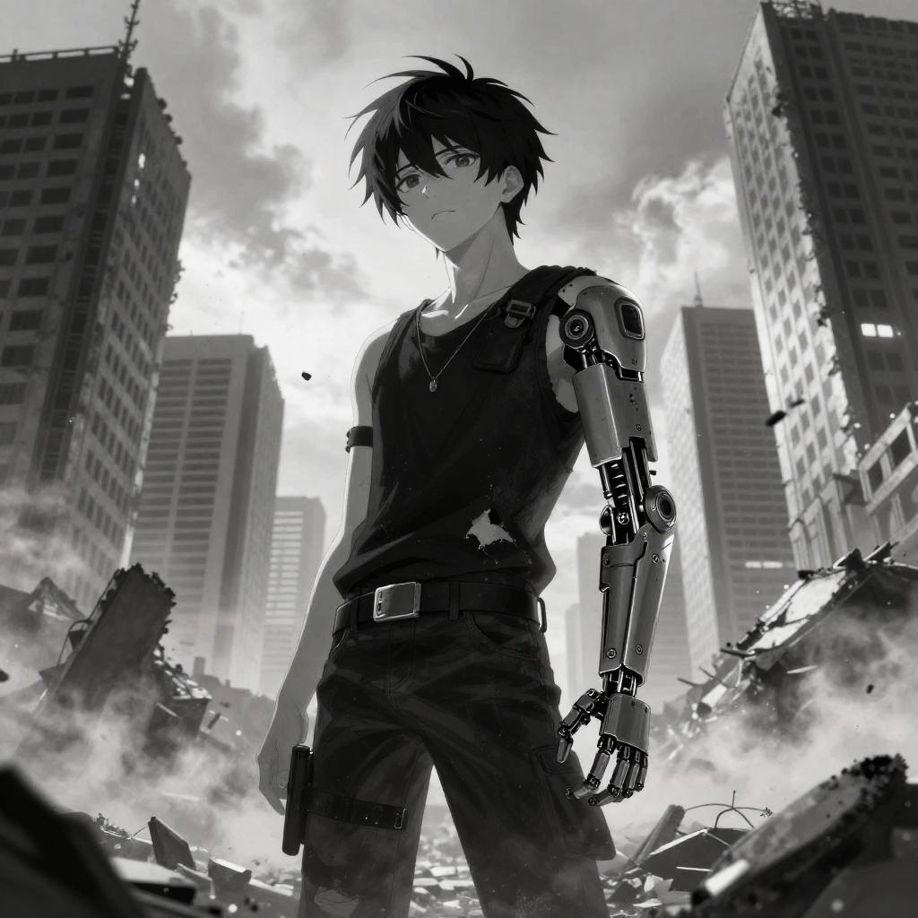 Black and white haired anime boy in a post-apocalyptic world, torn clothes and cybernetic arm, standing amidst ruins of skyscrapers, dramatic lighting with smoke and dust, anime style with gritty textures and vibrant monochrome contrast.