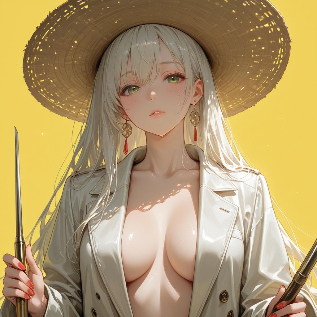 Masterpiece, high quality best quality, 1girl, breasts, earrings, hat, holding, jacket, jewelry, long_hair, looking_at_viewer, medium_breasts, open_clothes, red_lips, solo, upper_body, white_hair, yellow_background