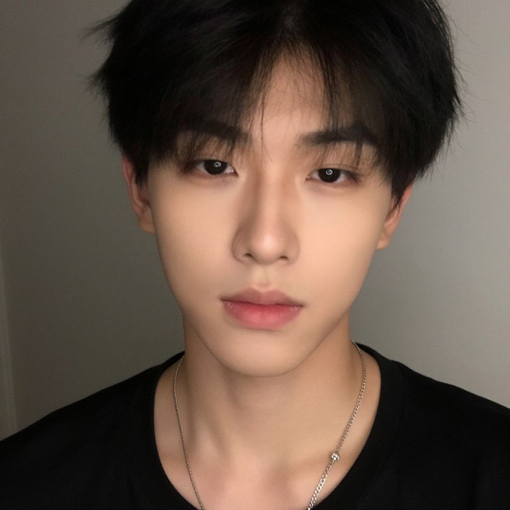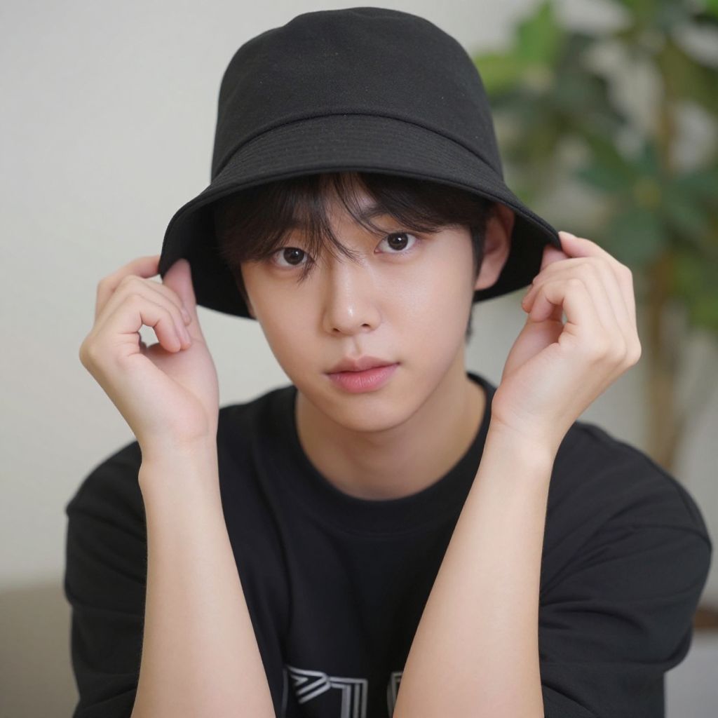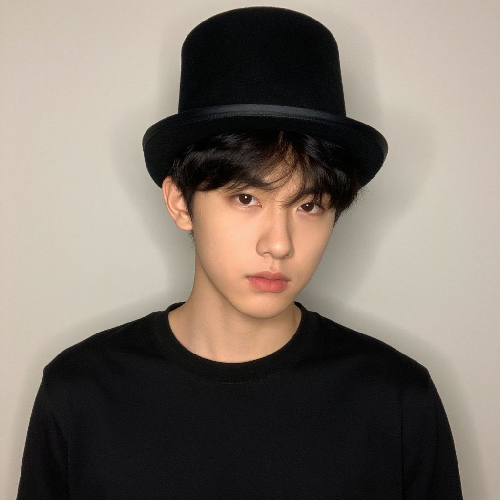 Photograph of an Asian young man with fair skin and black, slightly tousled hair, wearing a black, wide-brimmed hat and a black, plain T-shirt. He has a neutral expression, with slightly parted lips and dark, almond-shaped eyes. The background is a plain, light gray wall, creating a stark contrast with his dark clothing. The image has a digital, slightly overexposed feel, emphasizing the subject's face and hat. His overall look is simple and minimalist.