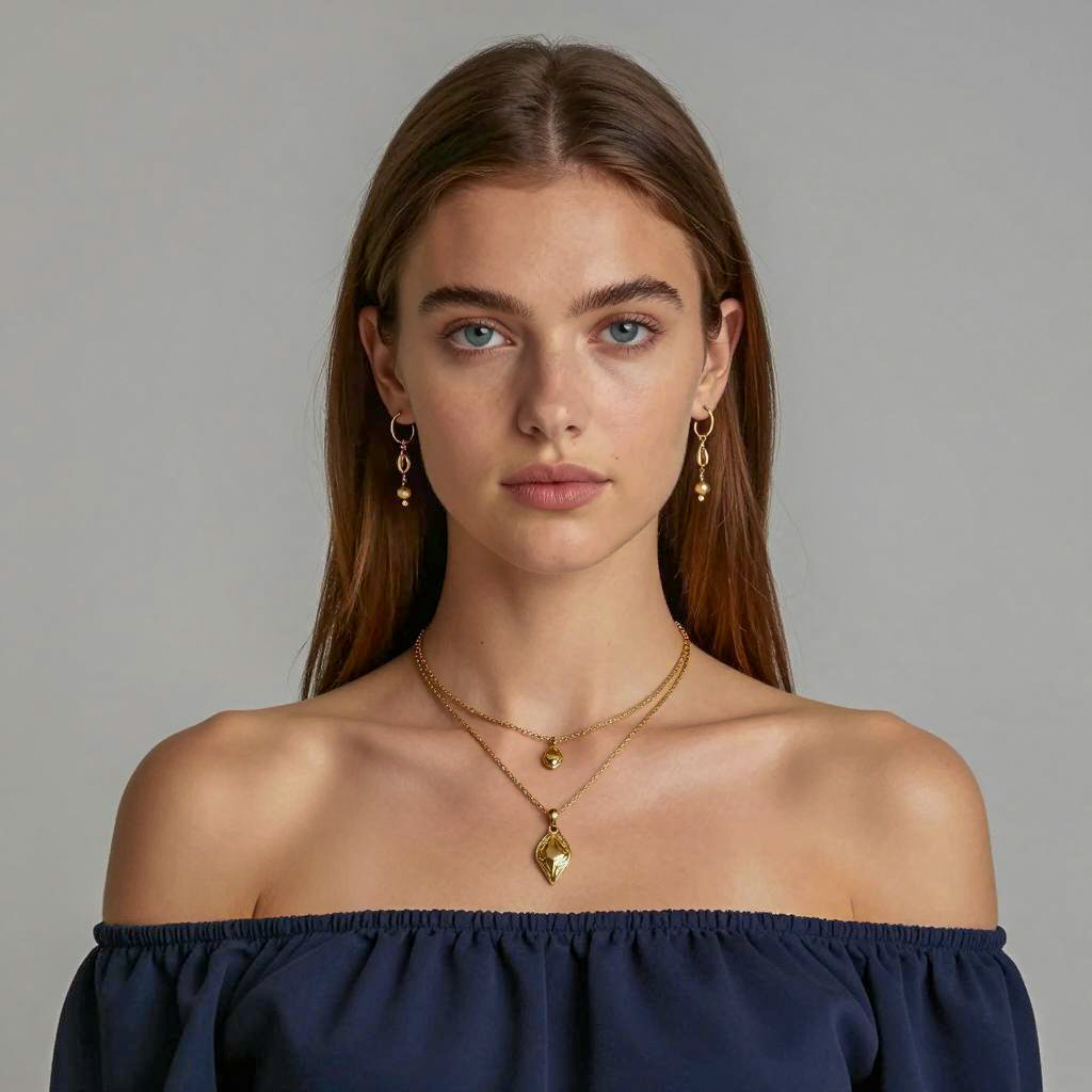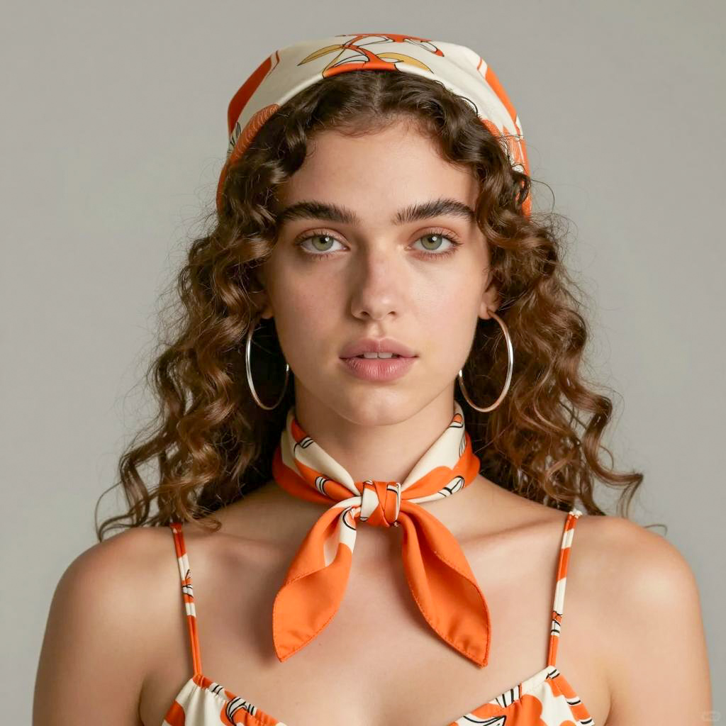 Young woman with curly brown hair, green eyes, and fair skin. She wears a patterned orange and white headscarf tied around her neck and head, with matching spaghetti straps. Large silver hoop earrings. Neutral gray background. She has slightly parted lips and an intense gaze. puqy.com in the bottom right corner.
