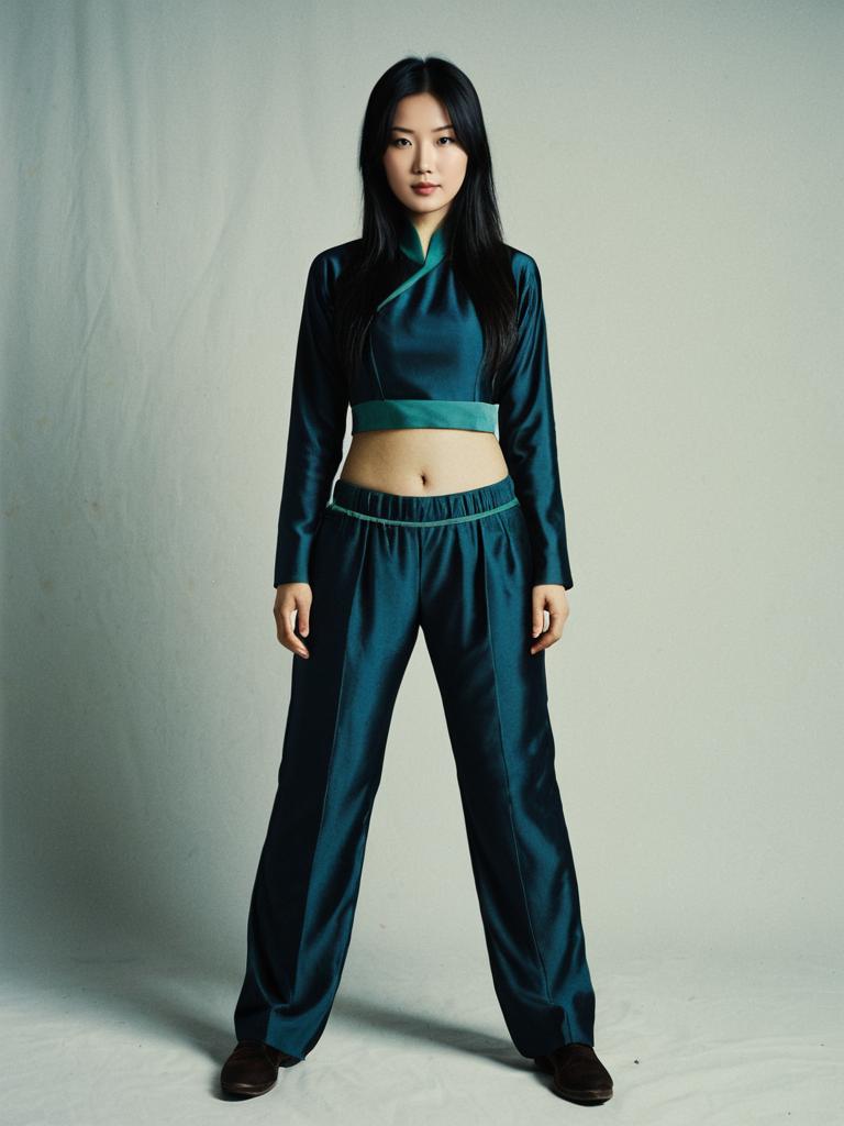 Silk two piece set costume, 1girl, solo, realistic, looking at viewer, standing, arms at sides, black hair, asian, long sleeves, pants, closed mouth