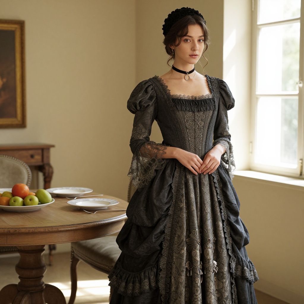 Elegant woman standing in a sunlit room, wearing a dark, Victorian-inspired gown with intricate lace detailing and puff sleeves, complemented by a choker necklace and a black headpiece, while a wooden dining table with fruit and plates is visible to her left and a window with natural light streams in from the right.