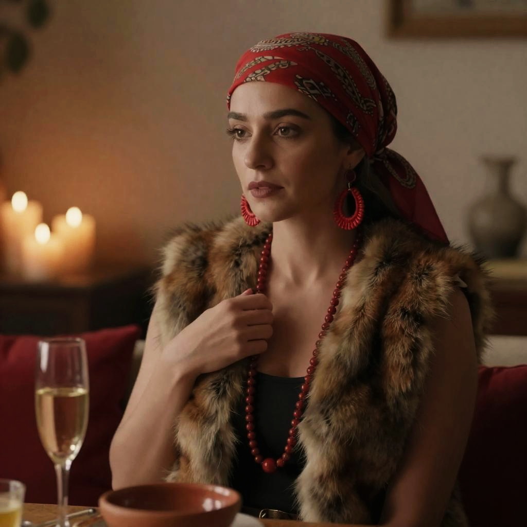 Woman with light skin, red patterned headscarf, large red earrings, fur vest, holding beaded necklace, looking to the side. Background: blurred candles, red cushions. Foreground: glass champagne flute, clay bowl. Indoor setting, dim lighting. Realistic photograph.