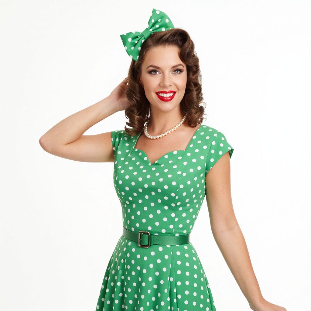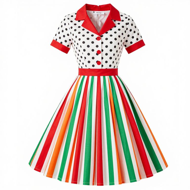 Vibrant 1950s polka dot and striped cotton day dress featuring a red collar, cuffs, and waistband, paired with a fitted bodice and flared skirt adorned with vertical stripes in red, orange, green, and white, complemented by three red buttons down the front.
