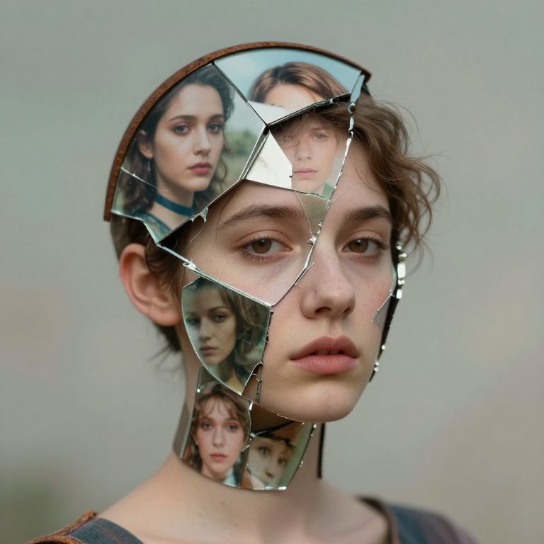 CynthiaPortrait, experimental portrait photography broken mirror portrait, head made of a collage of different facial features of different persons, face made of fractured rusty metal, chromatic background, calm and introspective, nostalgic wonder, retro-cute charm