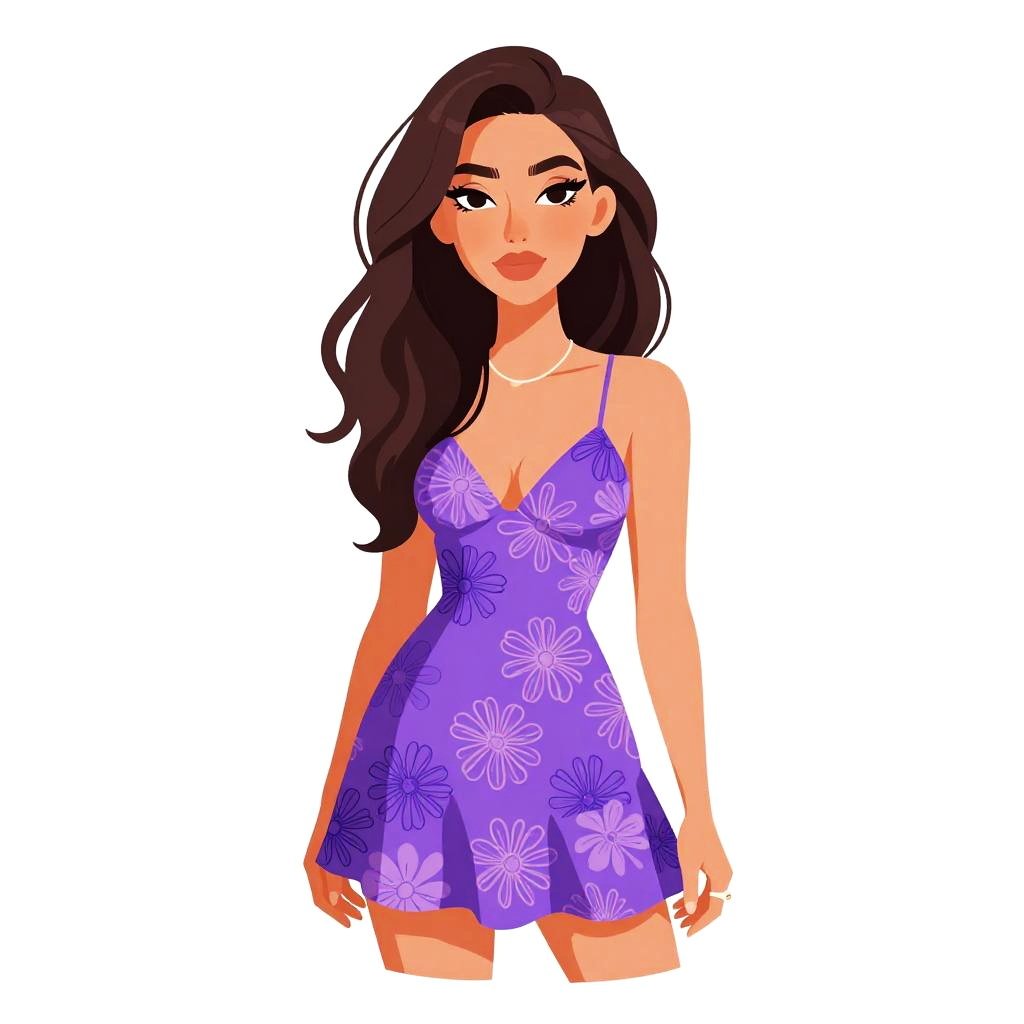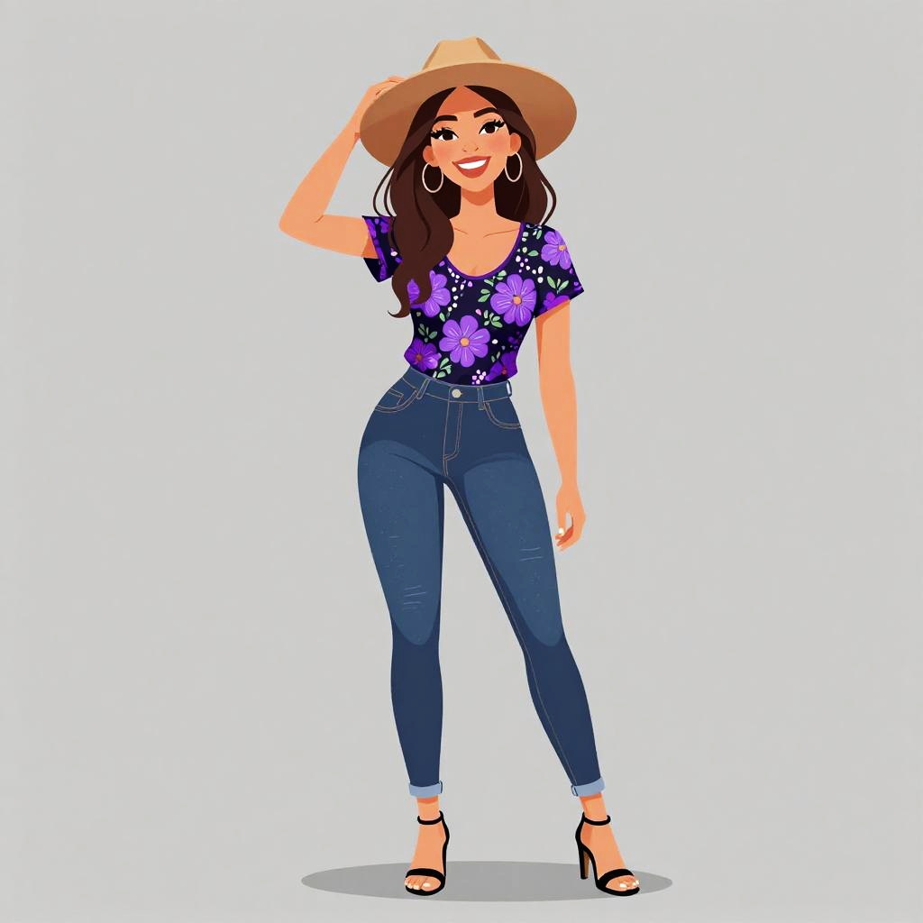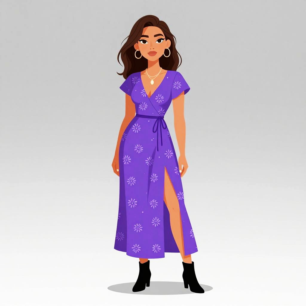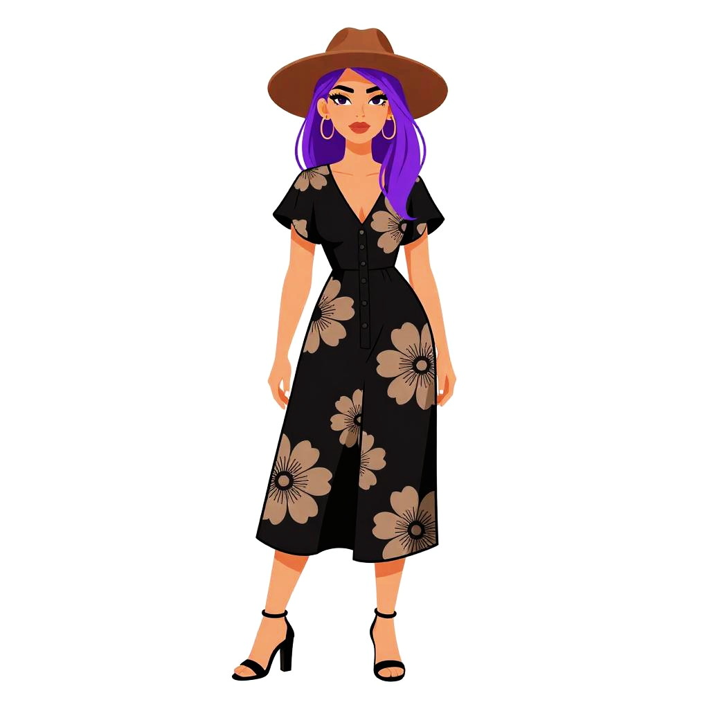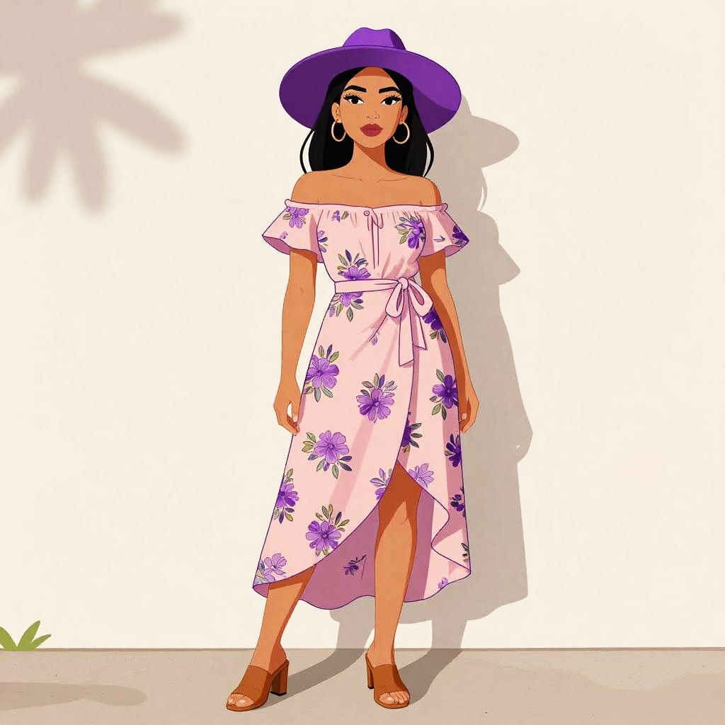 Woman with pretty face and pretty hair. Woman, bohemian chic, high-low midi dress in blush pink with floral print, off-the-shoulder neckline with ruffle trim, short flutter sleeves, wrap-style skirt, tan block heel mules, wide-brimmed hat in a coordinating shade, simple outdoor setting with a plain wall and shadow play from sunlight. --sref 1467