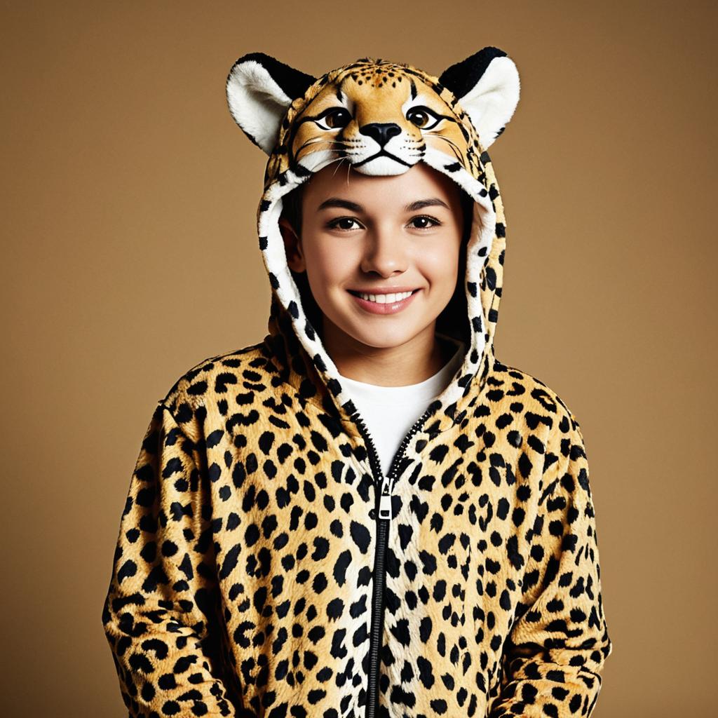 Portrait of a cheerful young boy wearing a realistic cheetah animal print costume hoodie with a zipper and hood featuring a cheetah face and ears, smiling against a plain brown background.