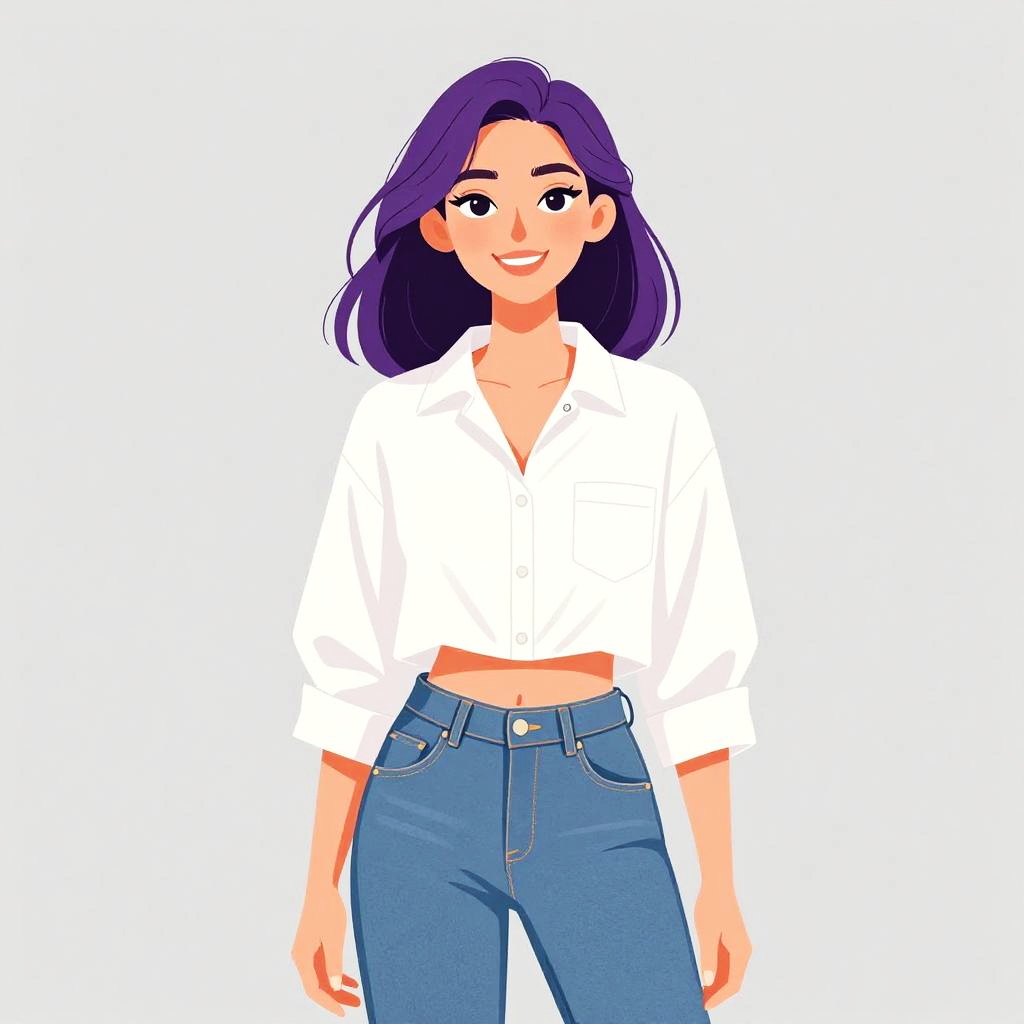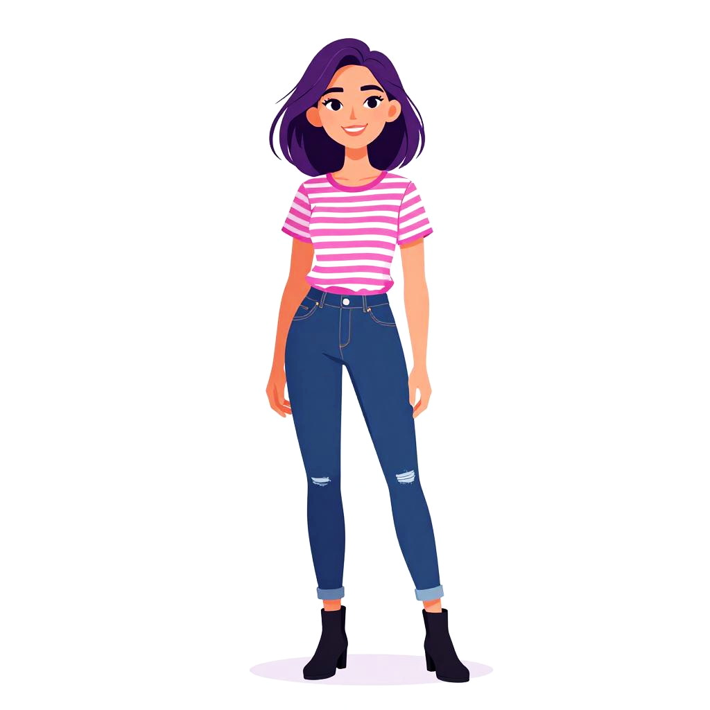 Woman with pretty face and pretty hair. smiling Woman, casual chic, short-sleeve T-shirt with horizontal grey and white stripes, lace detail on shoulders, dark skinny jeans, mid-rise waist, slip-on black sneakers with white soles, simple hairstyle, studio background --sref 1467