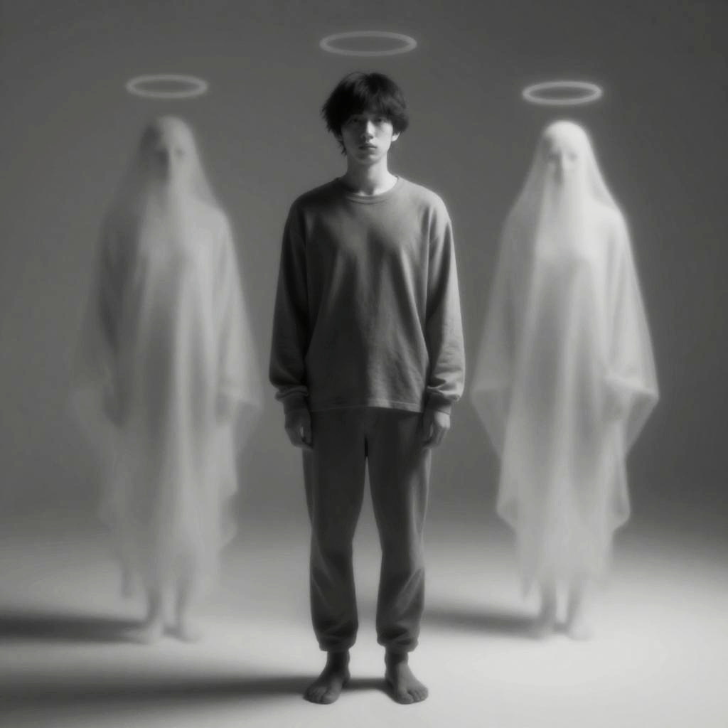 This is a digital, grayscale, semi-blurred image of a human figure standing with two ghost-like, ethereal forms floating to the left and right. The figure is androgynous with short hair, wearing a long-sleeved shirt and pants. The ghost-like forms are translucent and have circular, halo-like shapes above their heads. The background is a simple gradient from dark to light gray.