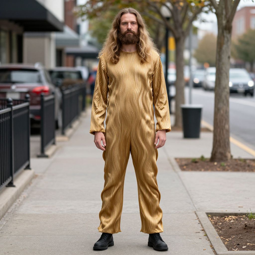 Photograph of a bearded man with long brown hair wearing a gold, metallic, full-body jumpsuit and black boots, standing on a city sidewalk