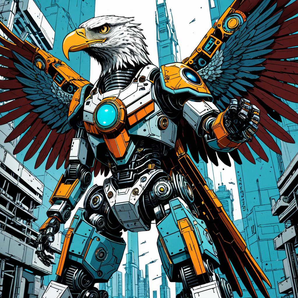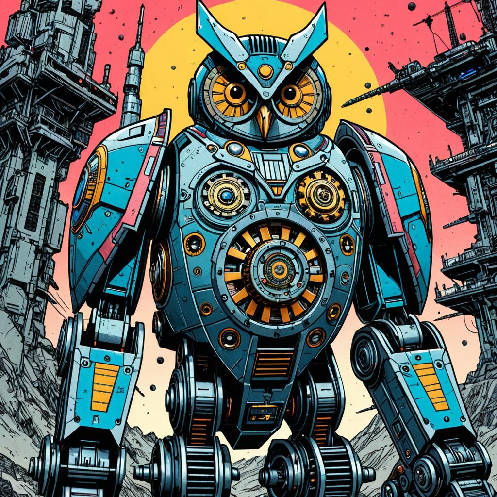 Ultra-detailed mechanical owl droid with vibrant Aurieha steel textures and chempunk design elements. The artwork combines space comic art style and Japanese manga influences, featuring sharp angles, intricate gears, and complex robotic components with a backdrop of advanced castle-like structures. Inspired by Kisho Kurokawa's aesthetic for sci-fi and mechanical majesty.