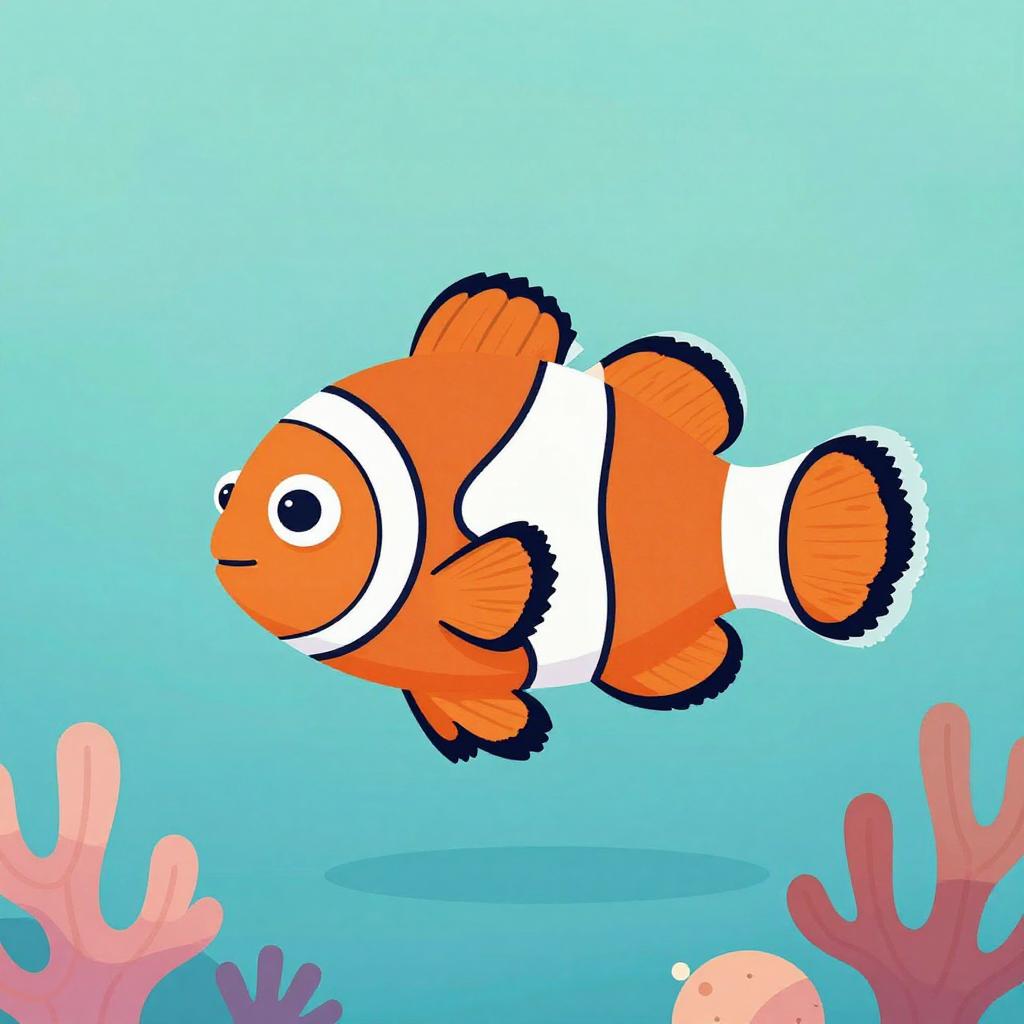 Jolly clown fish with colorful paint drips, playful and whimsical character design, bold outlines, bright coral and turquoise palette, simple background with soft gradients, modern whimsical vector, flat vector illustration, clean shapes and crisp edges, high contrast, center composition