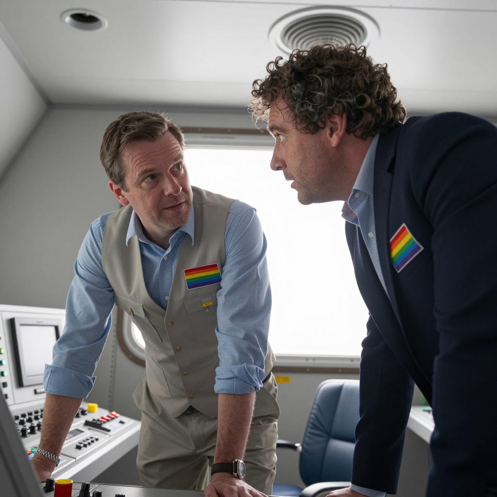 Four men in a close group. Foreground man in dark suit points right, second from left with dark hair and dark suit, central man with glasses, beard, green jacket, and dark turtleneck, rightmost man with brown hair, dark suit. Central man points, others listen. Background dark, blurred. Intense expressions on central and rightmost men.