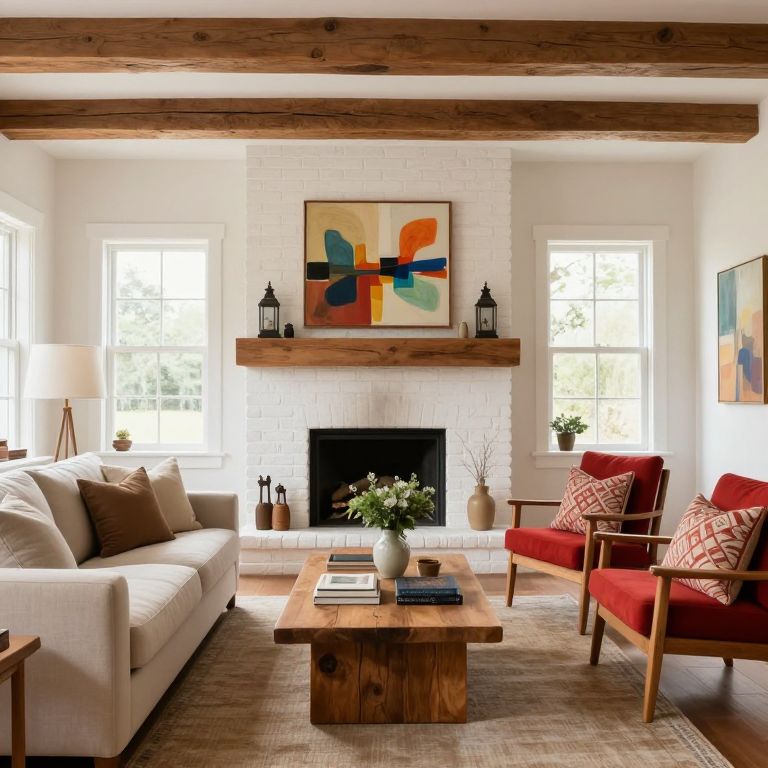 Cozy modern living room with white brick fireplace, wooden beams, white sofa, red armchairs, wooden coffee table, abstract art, and natural
