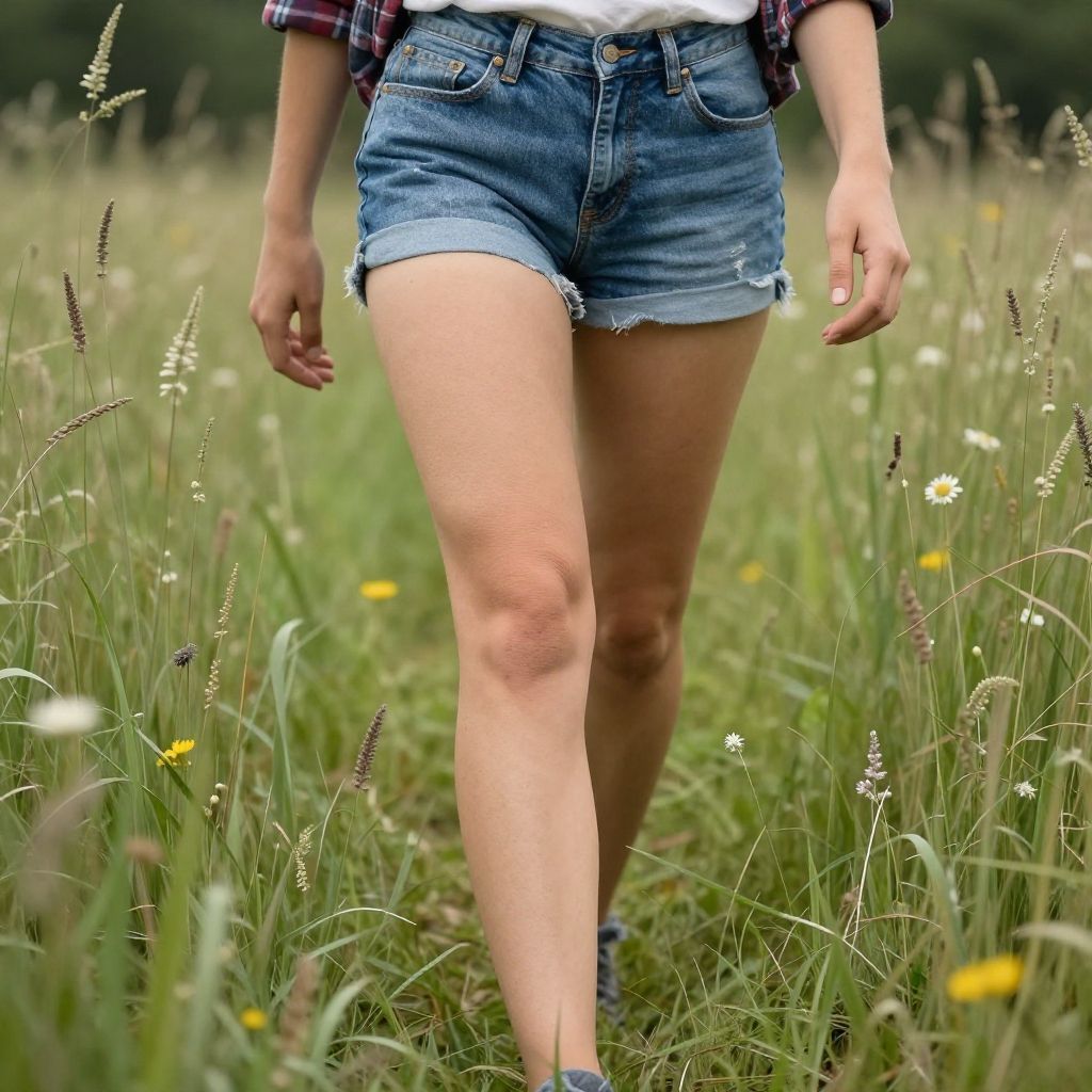 Photograph of a woman's legs walking in a grassy field, wearing blue denim shorts with frayed edges and a plaid shirt, surrounded by
