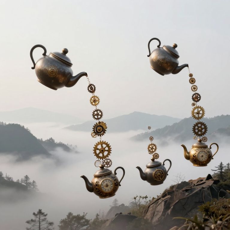 A surreal procession of floating teapots hovers serenely above a misty mountain landscape, each pouring cascades of intricate clockwork gears instead of tea, defying gravity and reality alike.