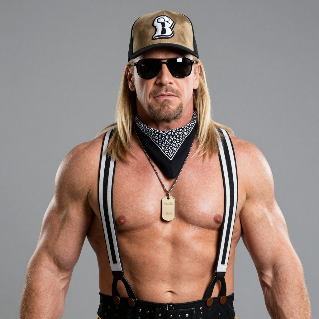 Muscular man with long blonde hair, baseball cap, sunglasses, black bandana, dog tags, suspenders, and bare chest, stands confidently against