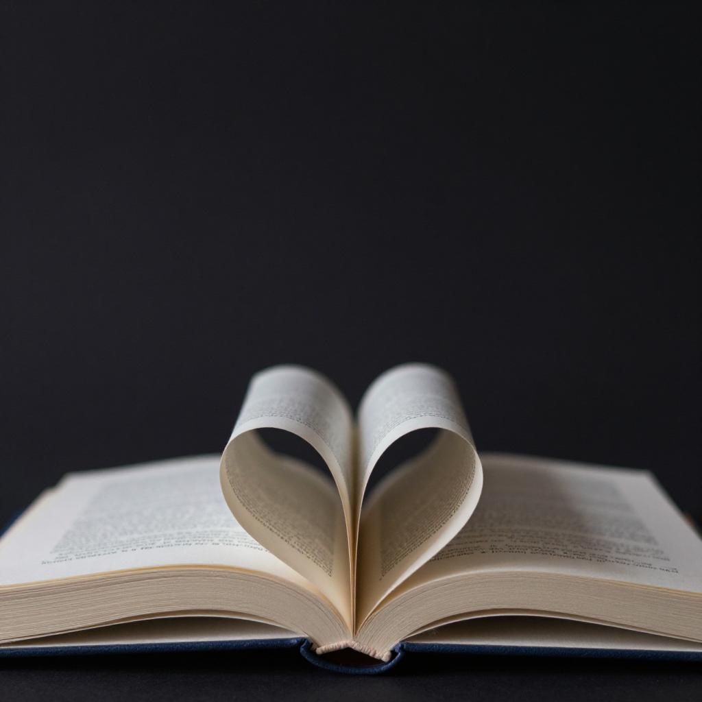 Photograph of an open book with pages forming a heart shape, centered against a solid black background. The book is lit from above, creating soft, even lighting with no shadows. The camera angle is straight-on, capturing the book at eye level. The background is completely blurred, focusing solely on the book. The depth of field is shallow, emphasizing the book's details.
