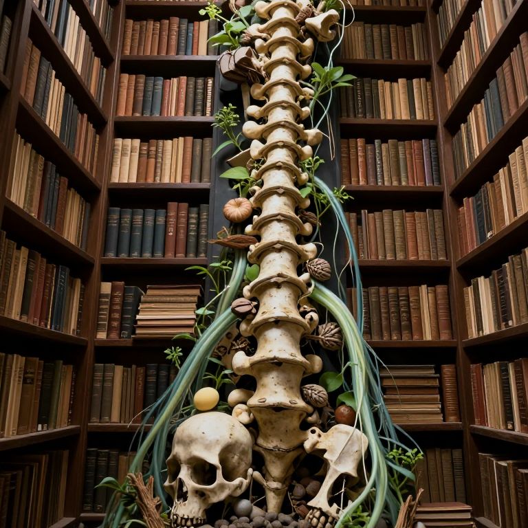 A library grows vertically from the bones of an ancient god, with books sprouting from vertebrae and wisdom flowing from the spine like sap.