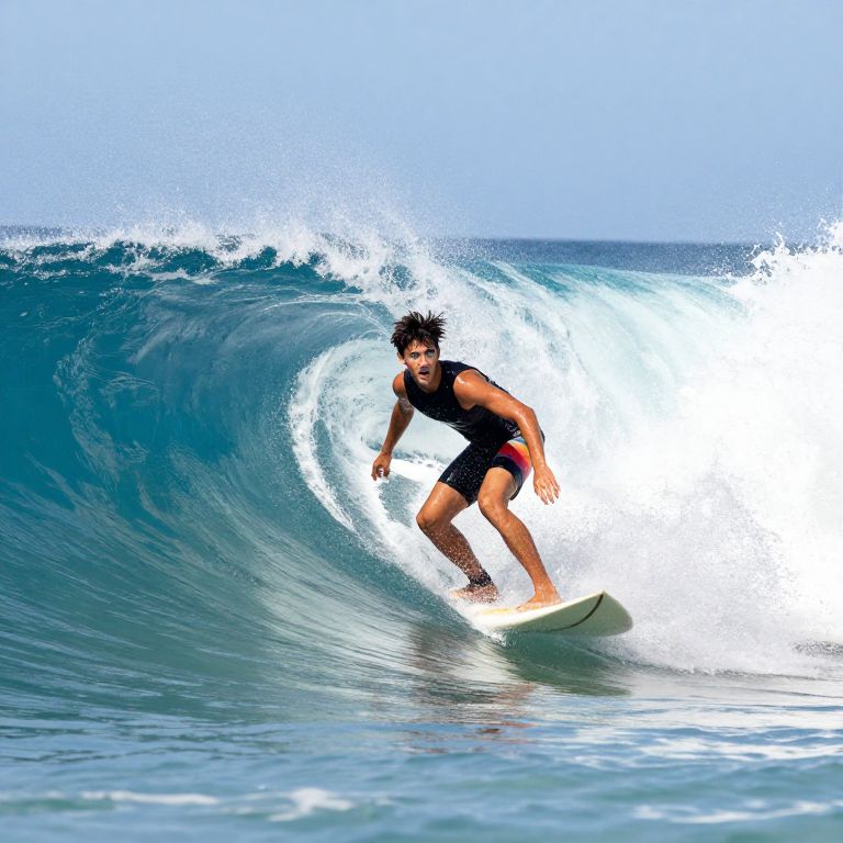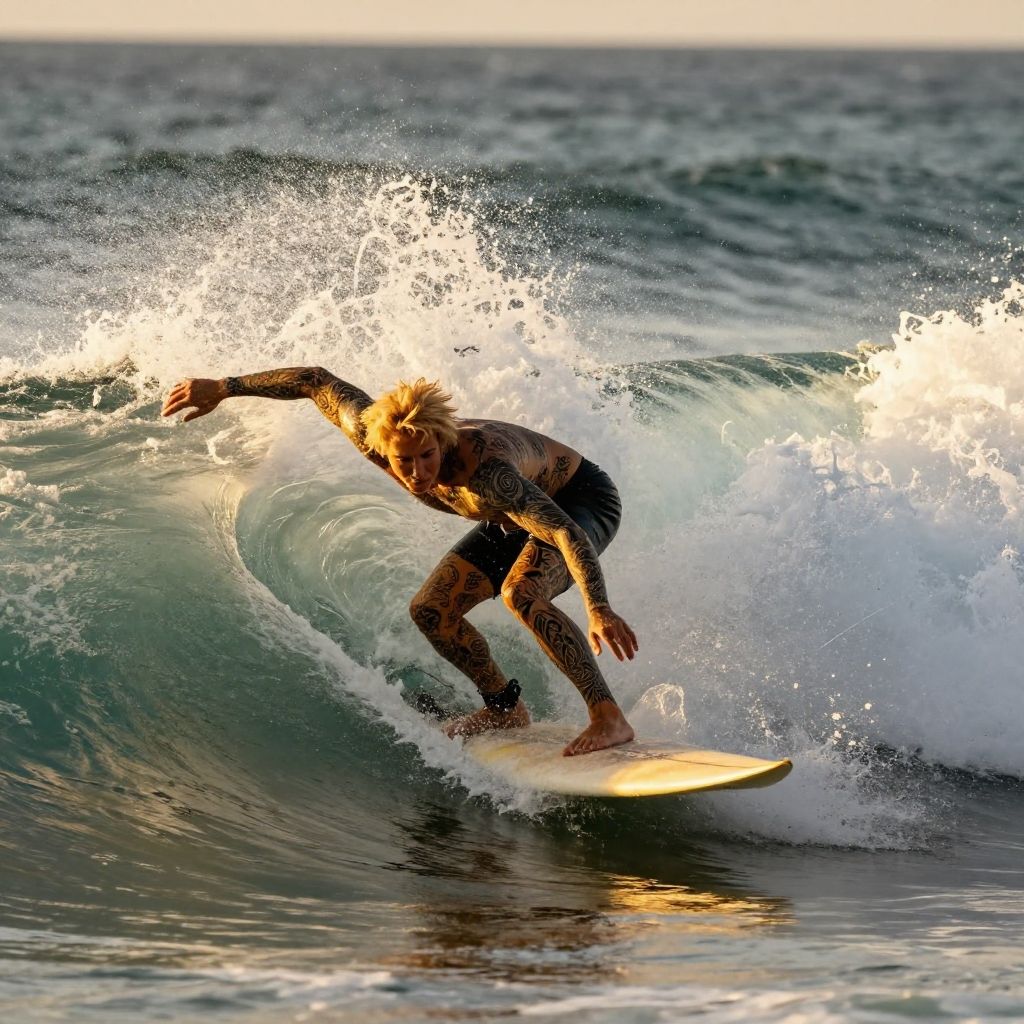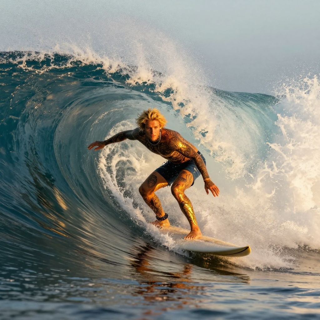 Tattooedblondesurfer riding a massive wave at sunset, intricate tattoos glowing under golden light, dynamic ocean spray, vibrant colors, cinematic style