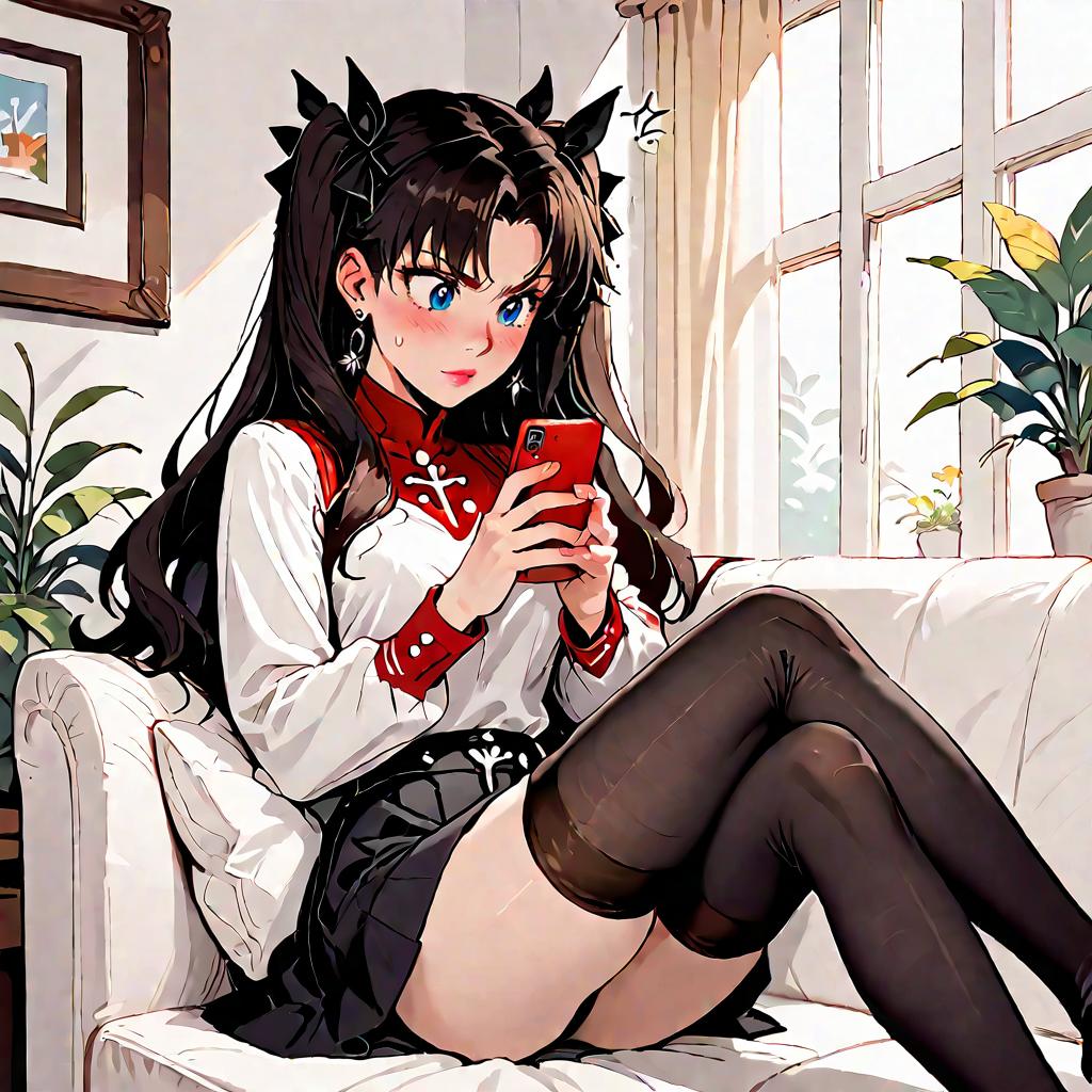 Score_9, score_8, score_7, source_anime, rating_general, 1girl, tohsaka rin, red turtleneck, black skirt, thighhighs, zettai ryouiki, living room, sofa, sitting, looking at phone, surprised, annoyed, sweatdrop, plant