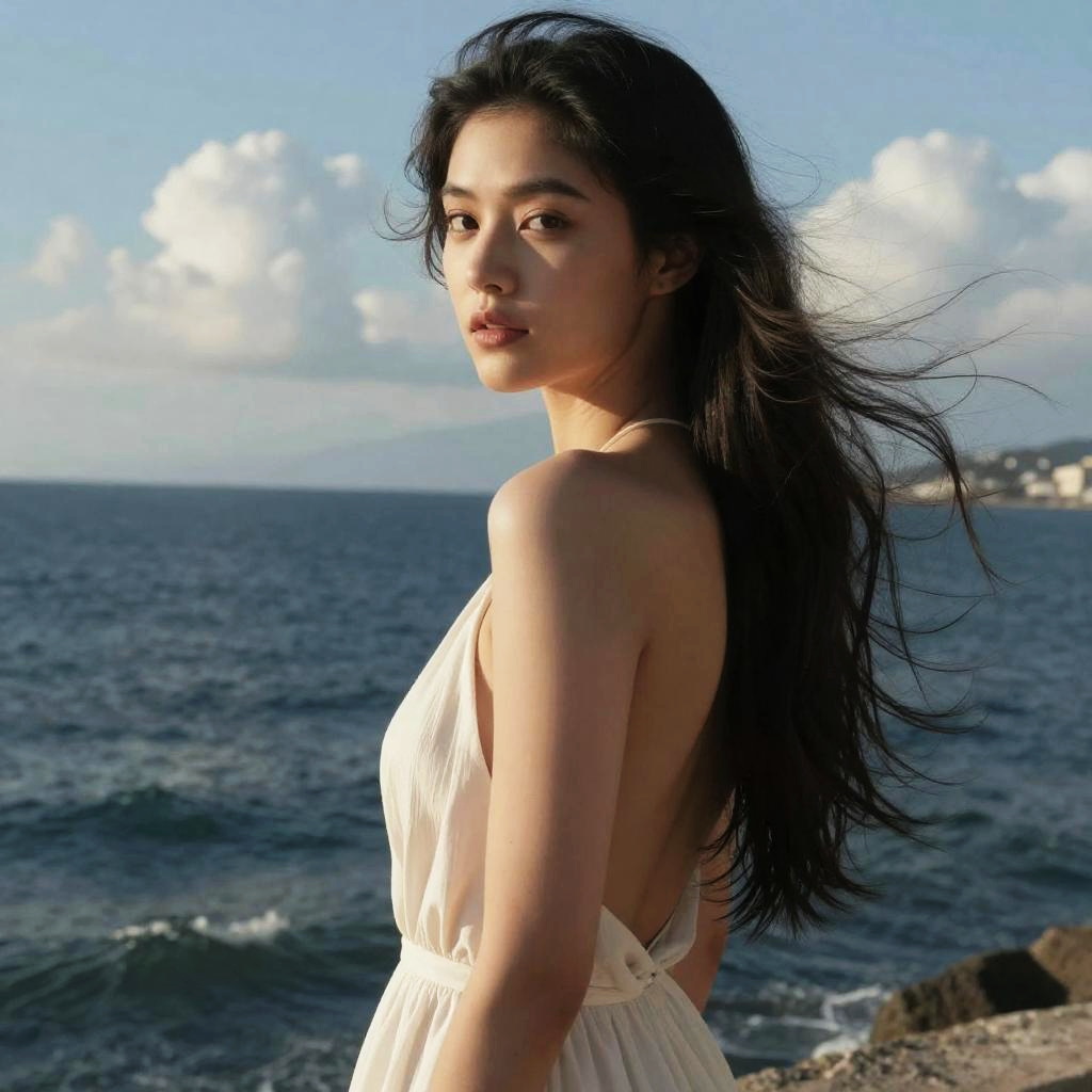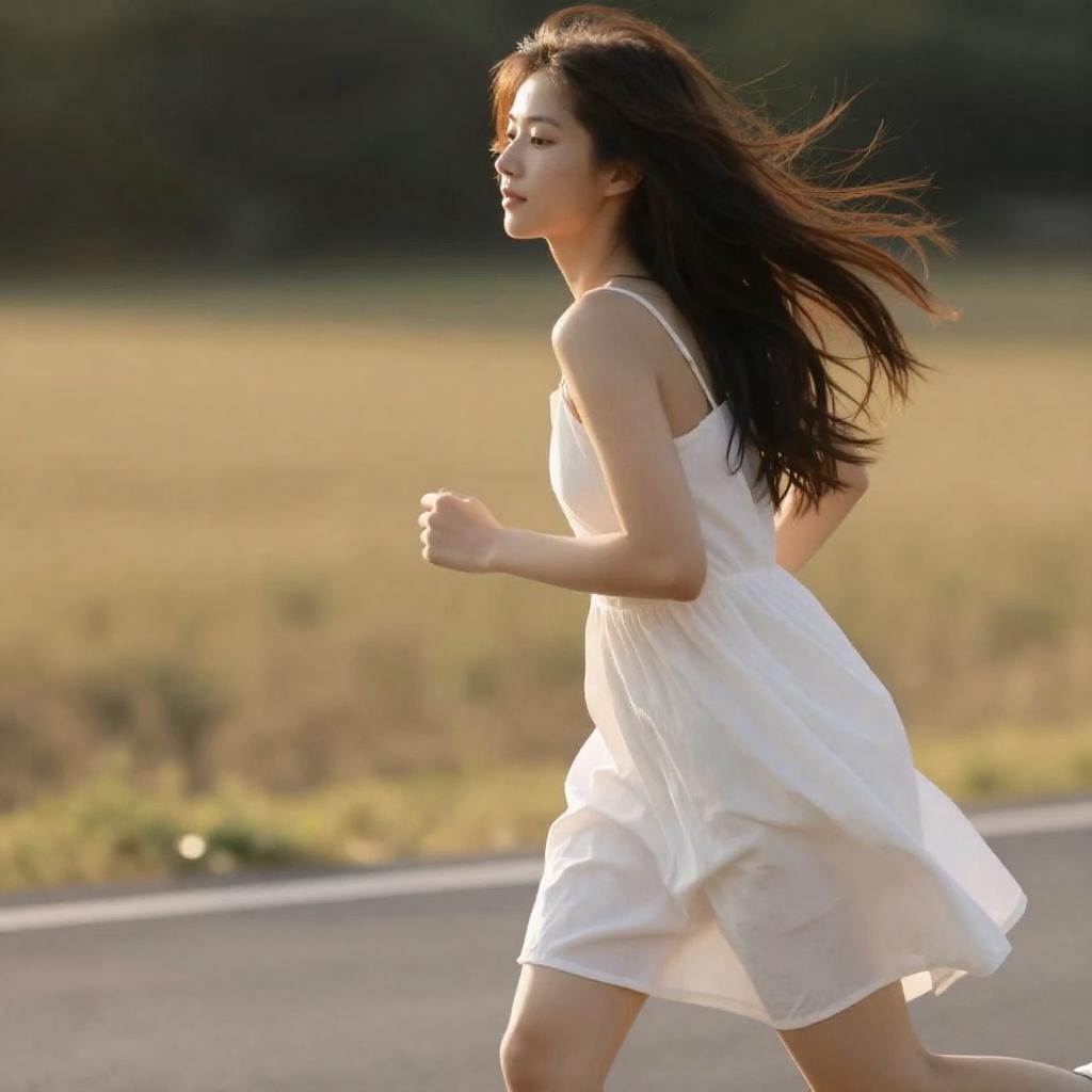 Photograph of a woman with long brown hair, wearing a white dress, running along a blurred, sunlit road with a yellowish, grassy field on the left and dark green bushes in the background. Her face is partially obscured by her hair. The image has a dynamic, slightly tilted perspective.
