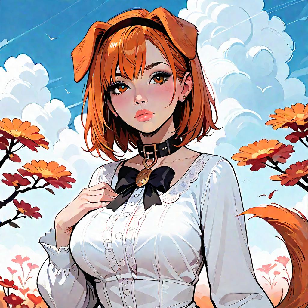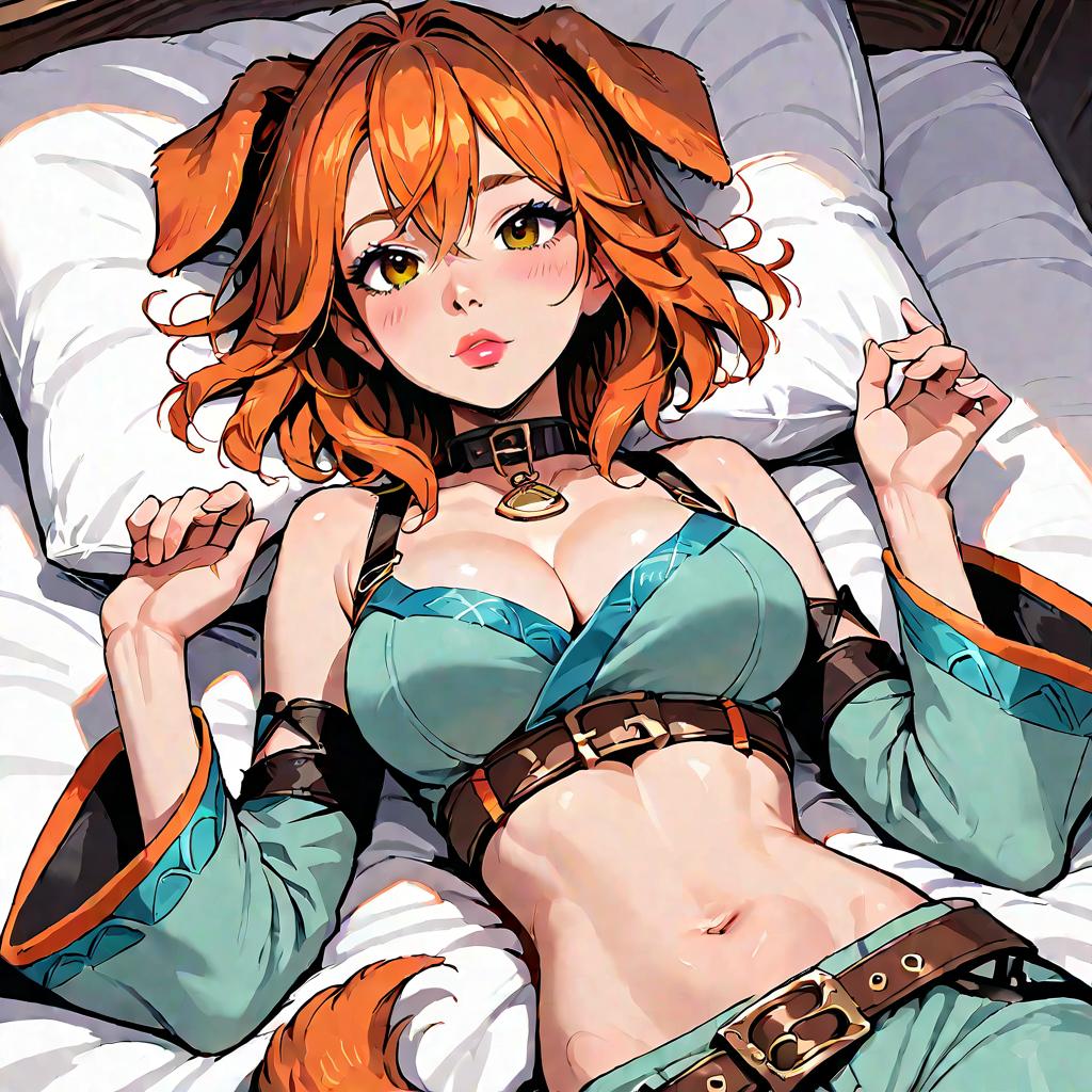 This digital anime-style illustration depicts a young woman with orange hair, dog ears, and a black collar with a gold tag, lying on a white pillow. She has large, expressive green eyes and is wearing a teal, lace-trimmed bra that accentuates her large breasts, along with matching teal pants held by a brown belt. Her skin is fair, and she has a slim, toned physique. Her hands are raised near her head, and she has a slightly surprised or playful expression. The background is minimal, focusing on the white pillow and the soft lighting, emphasizing her vibrant colors and detailed features.
