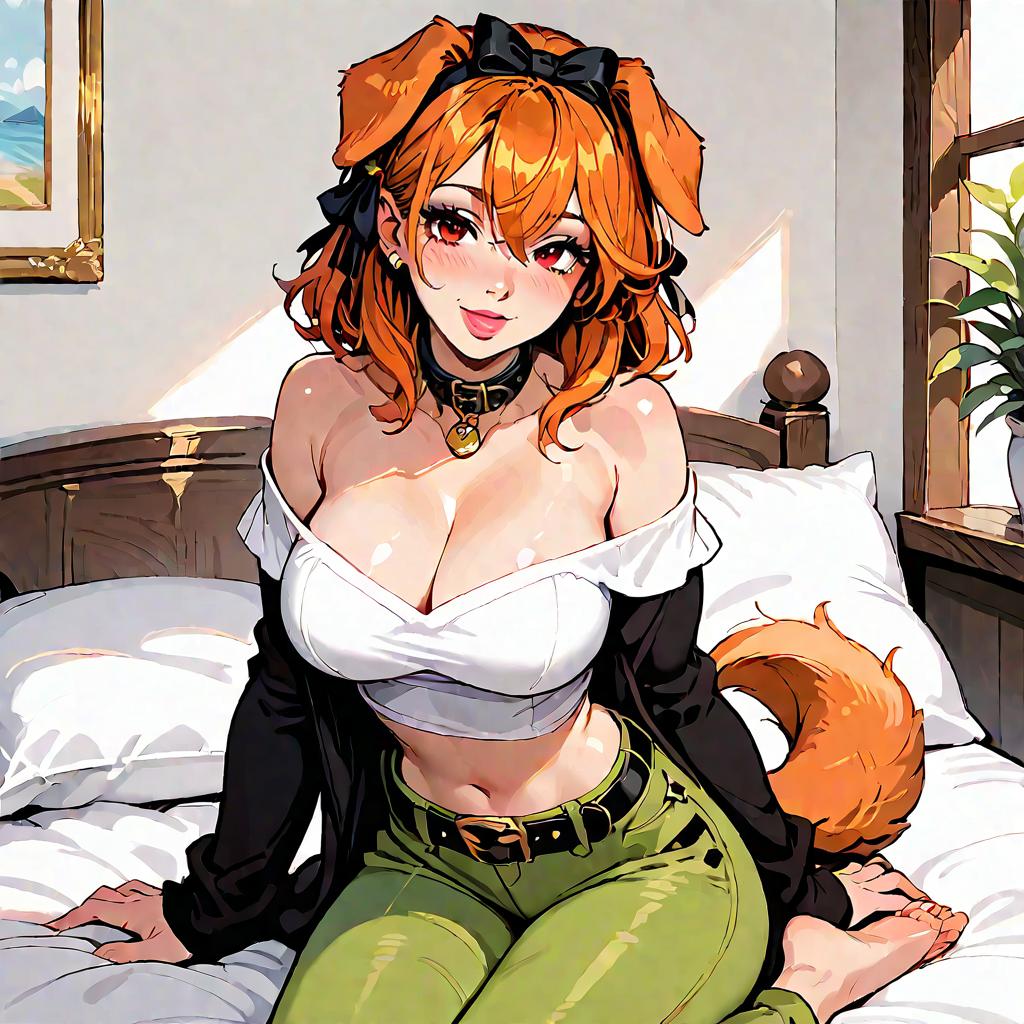 Masterpiece, best quality, highly detailed, score_9, score_8_up, score_7_up, score_6_up, source_Anime, 1girl, breasts, animal ears, solo, collar, tail, dog ears, blush, black collar, dog girl, floppy ears, navel, on back, large breasts, looking at viewer, cleavage, lying, hair between eyes, fantasy, bare shoulders, orange hair, green pants, dog tail, brown eyes, pillow, open mouth, pants, orange fur, belt, parted lips, thighs, bangs, medium hair, hands up, brown belt, detached sleeves, bed sheet, short hair, on bed, collarbone