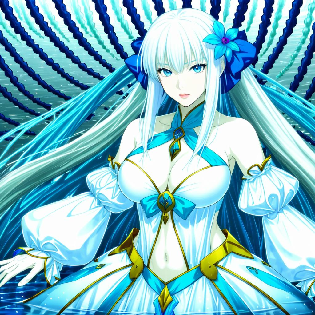 Digital anime-style illustration of Morgan Le Fay as a water princess from Fate/Grand Order. The character features very long white hair with blue highlights styled in twin braids and a French braid, adorned with a blue flower and ribbon. She has striking blue eyes, a white and blue outfit with gold trim, including a revealing top with bare shoulders, detached puffy long sleeves, and decorative details. The background features an aquatic theme with swirling blue patterns.