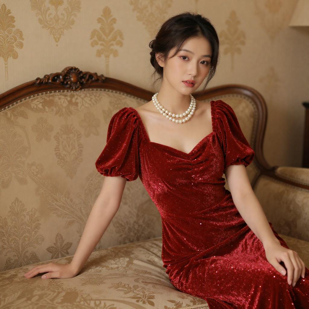 Woman in red, sparkly dress with puffed sleeves, pearl necklace, dark hair in an updo, sitting on a beige, patterned sofa. Ornate chair in background, patterned wallpaper, gold accents. She gazes slightly to the side, hands resting on sofa. Warm lighting.