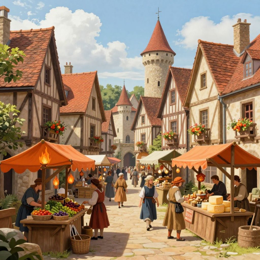 Vibrant medieval marketplace street scene featuring wooden stalls with orange canopies symbolizing the element of fire. The market is filled with assorted goods, produce, and cheese wheels. Surrounding the street are half-timbered medieval buildings with red-tiled roofs and towers in the background. Townsfolk in period clothing stroll and shop under a bright, partly cloudy sky. The atmosphere is lively and whimsical, inspired by Howard Pyle's illustrative style.