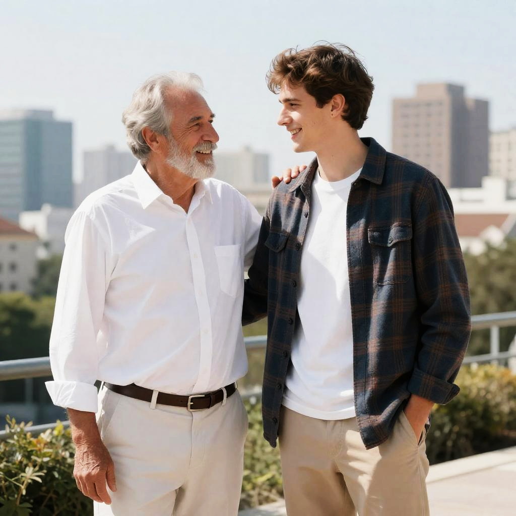 Photograph of two men standing outdoors in a cityscape setting. The older man with gray hair and a white beard wears a white shirt and white pants, smiling warmly with his hand on the younger man's shoulder. The younger man, with brown hair, is dressed in a white t-shirt, plaid jacket, and beige pants, smiling back with one hand in his pocket. The background features tall buildings and greenery under bright daylight with a clear sky.