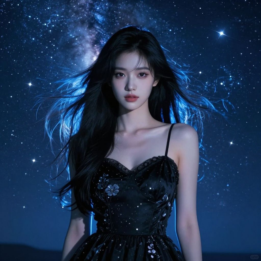 Photograph of an East Asian woman with long, flowing black hair illuminated by blue lighting, standing against a starry night sky with the Milky Way visible. She wears a black, spaghetti-strap dress adorned with subtle sequins, revealing her slender arms and delicate collarbones. Her pale skin contrasts with the dark dress and blue light, and her red lipstick adds a bold touch. Her expression is neutral, with a slight hint of allure. The background is a deep blue, enhancing the celestial theme. The image has a magical, ethereal quality.