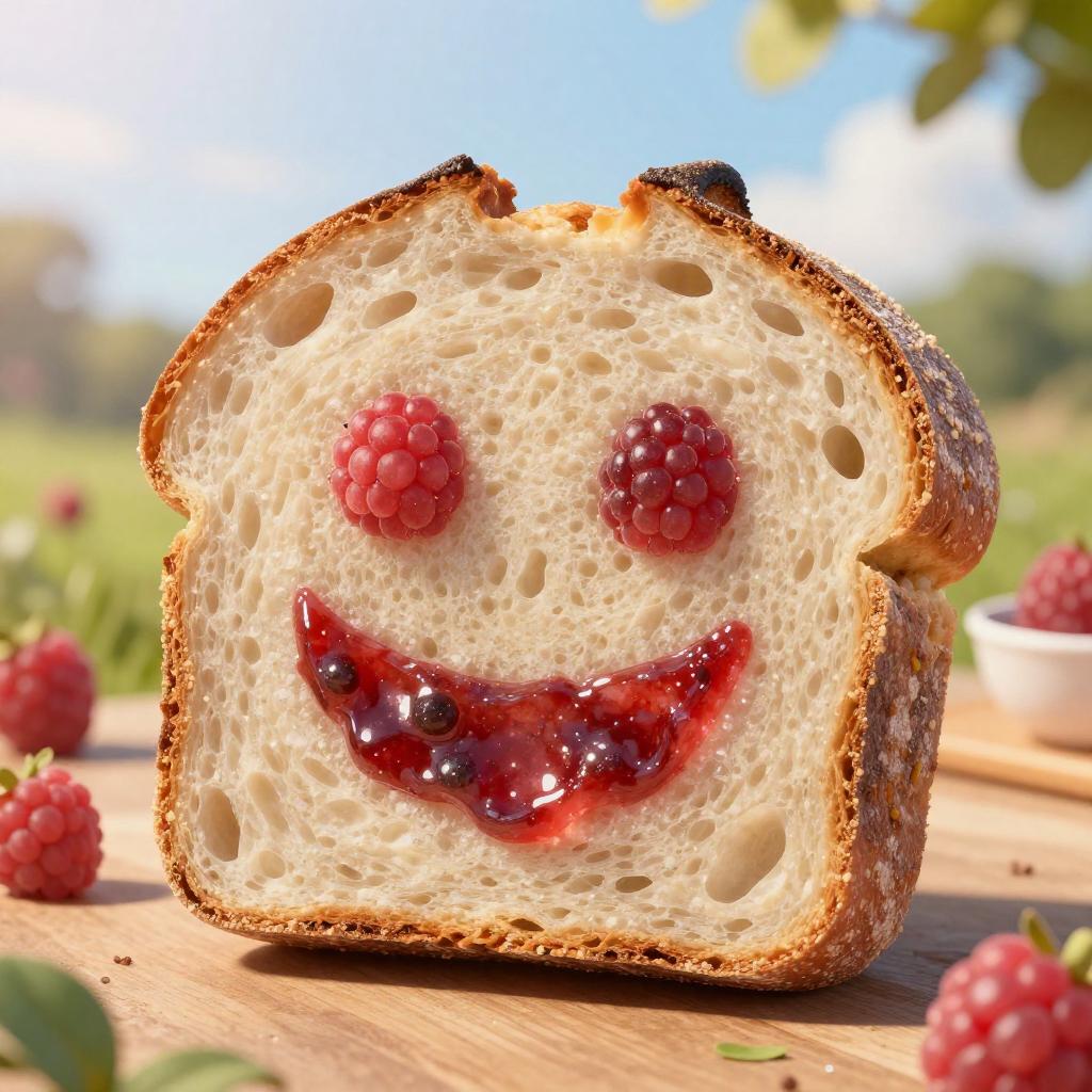 Fantastically designed toast with a happy face jam pattern, super crisp, high fidelity, cloudy day, 3D digital painting, intricate detail, concept art, 8k, trending on Artstation, Unreal Engine 5