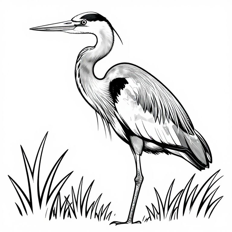 Great blue heron coloring page featuring peaceful heron in marsh grasses, bold lines with fine detail on feathers and beak, simple background, artistic illustration style