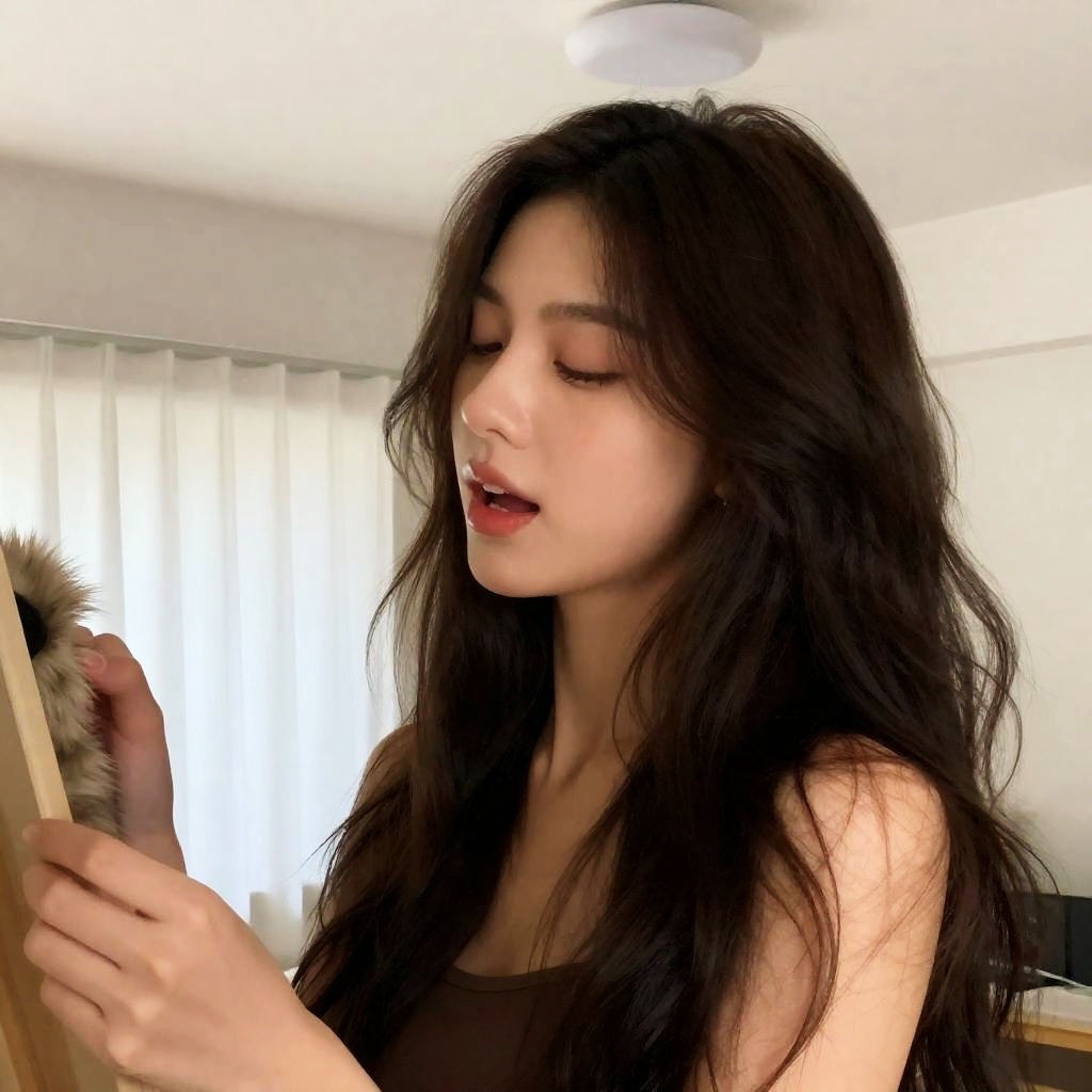 Woman with closed eyes, mouth slightly open, wearing brown top, long wavy dark brown hair, holding furry object, indoors, soft light, painting on wall, white curtain, ceiling light fixture.