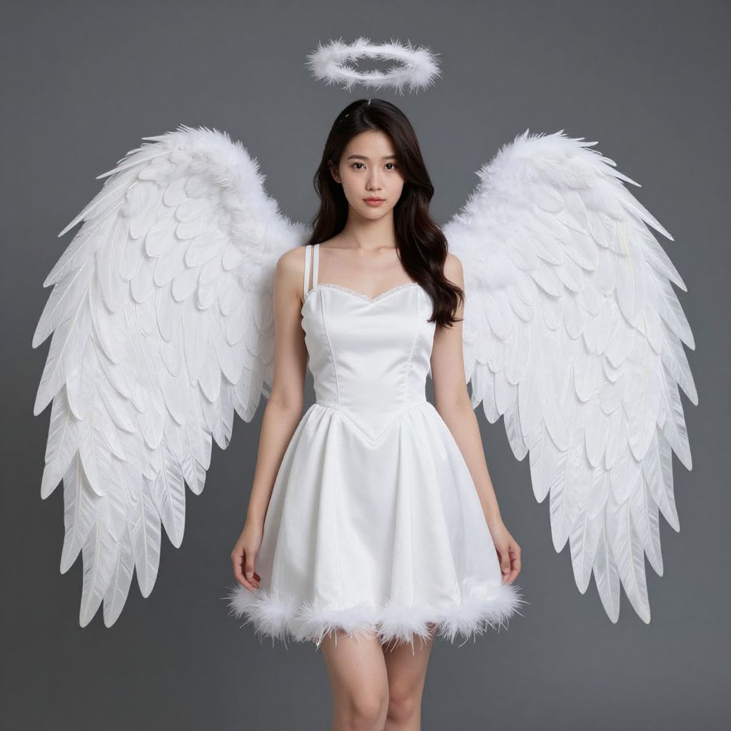 Feather Angel Wings Costume, woman in white dress with large white wings
