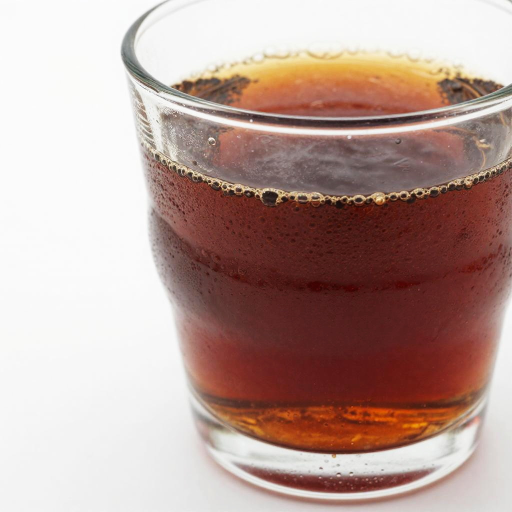 This is a close-up photo of a glass filled with a dark, fizzy beverage with a reddish-brown tint. The glass has a rounded base and a wide, shallow bowl with condensation on the outside. The background is bright white, making the glass and drink the focal points. The liquid inside looks carbonated, with bubbles visible near the surface.