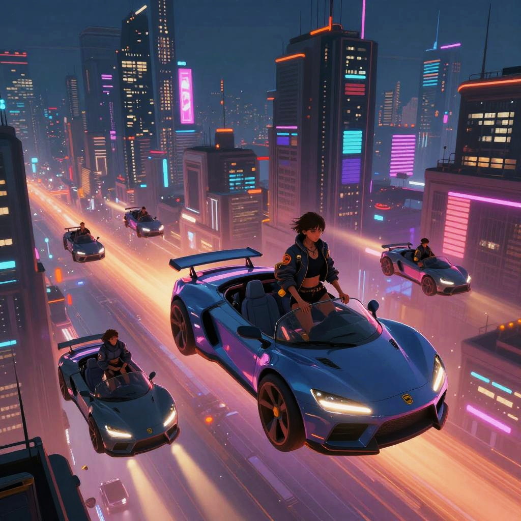 Amine style futuristic cityscape with neon lights, flying cars, and characters in cyberpunk fashion, vibrant color palette, highly detailed, digital painting, energetic atmosphere