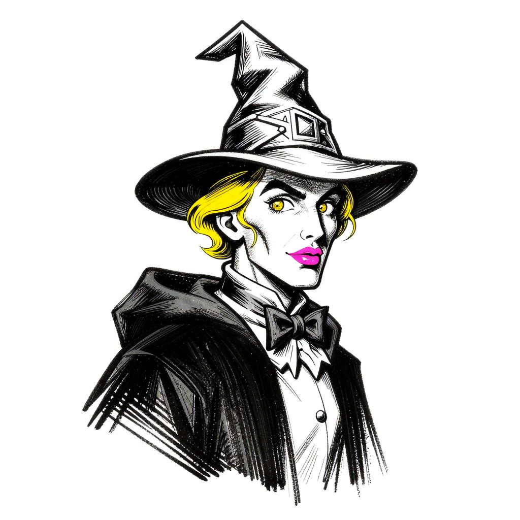 Digital pop-art style drawing of a witch with yellow hair, pink lips, black hat, black cloak, white shirt, and bow tie.