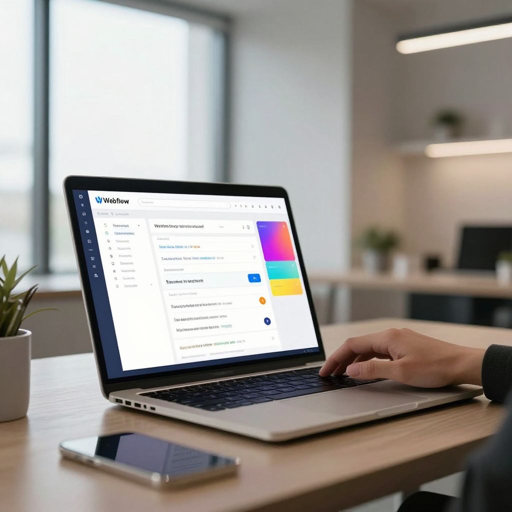 A digital artist working on a laptop using Webflow to change hyperlink colors, colorful design elements around, ambient lighting, minimalist modern office, large window with daylight, emphasizing web design and UI/UX creativity
