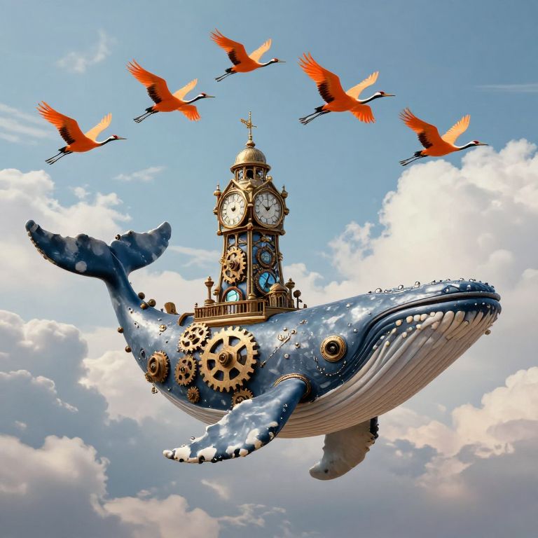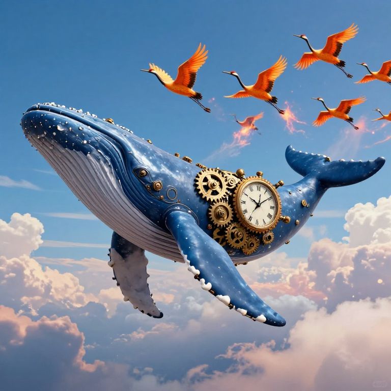 A clockwork whale swims through a sky filled with cogs and steam, pursued by a swarm of paper cranes shaped like burning hourglasses.
