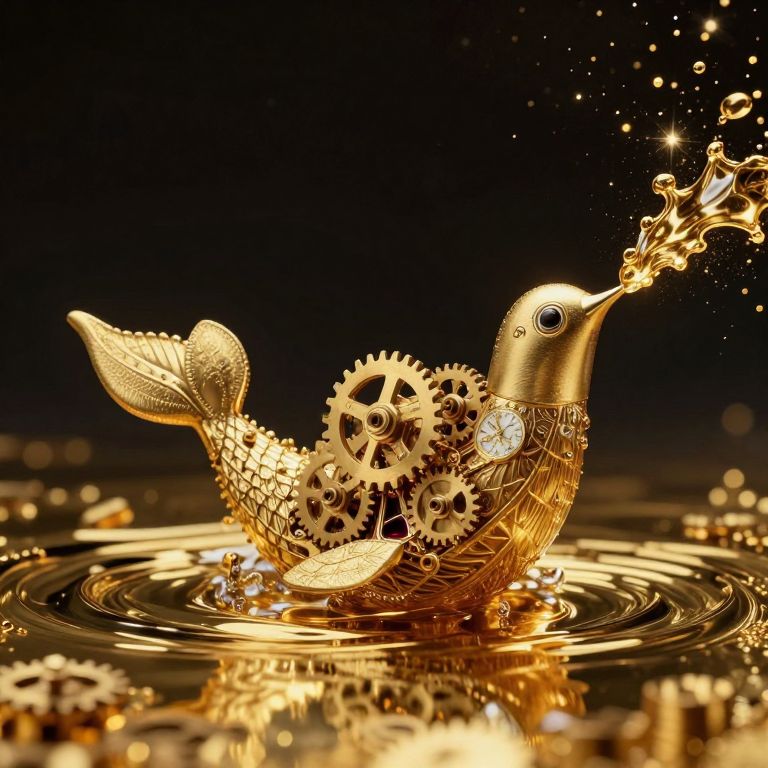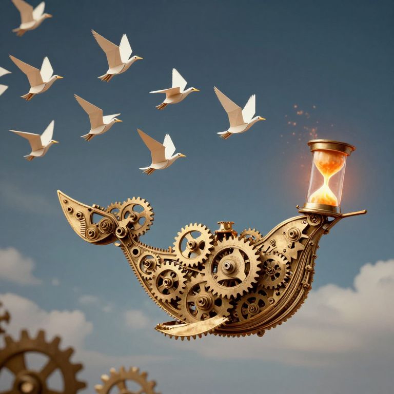 Steampunk-style golden gear bird with glowing hourglass, soaring blue sky, white birds in background, blurred gears in foreground.