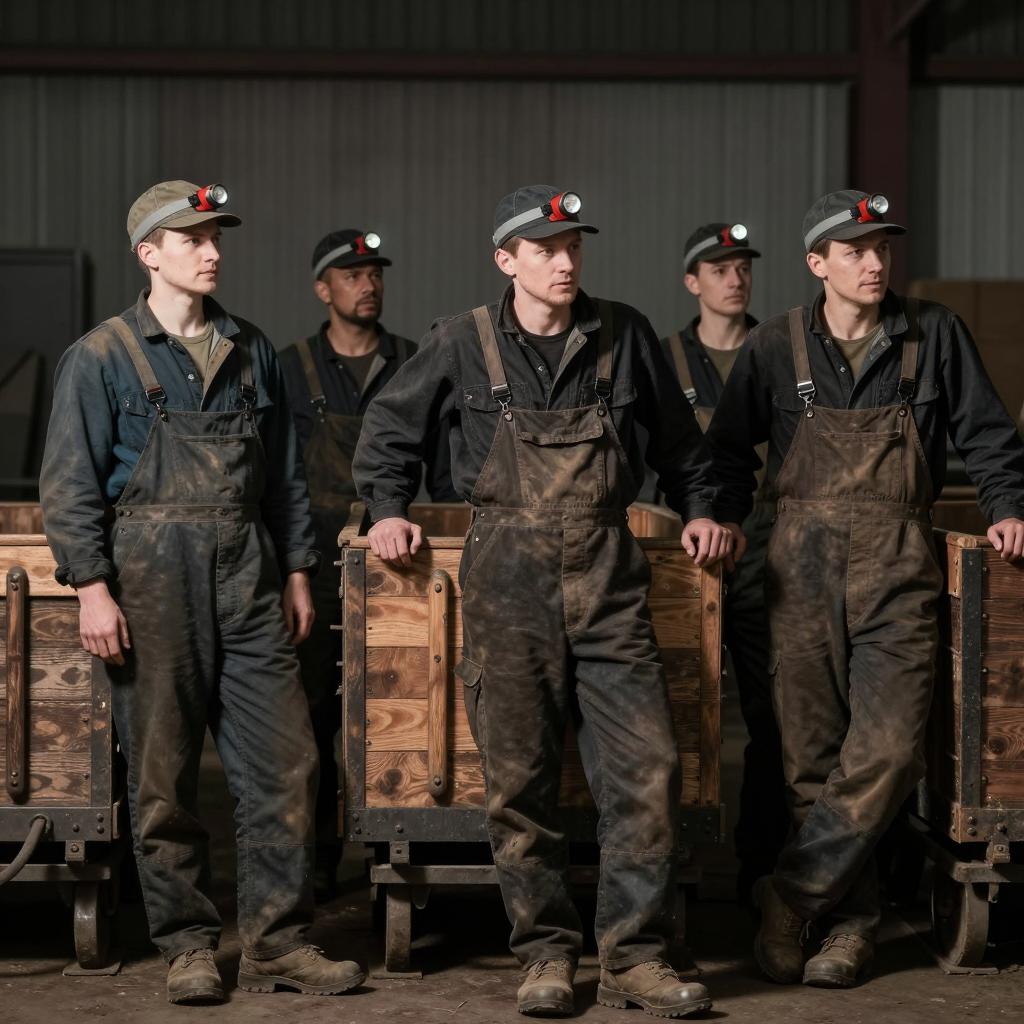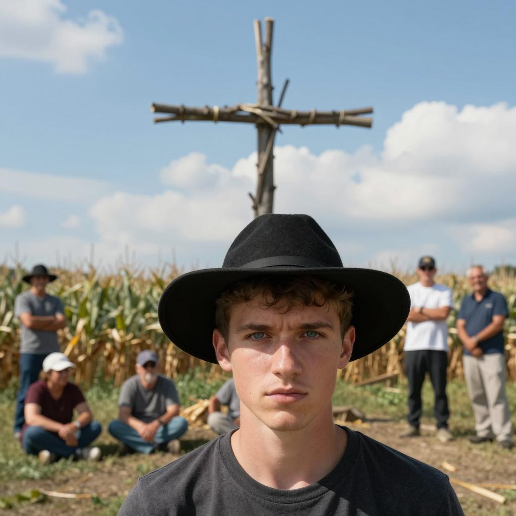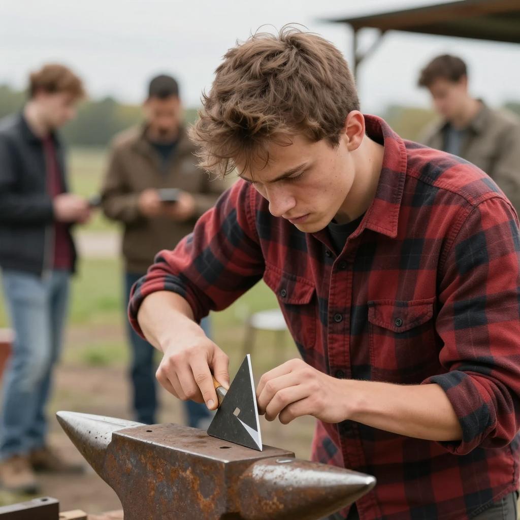 Young man with short brown hair, wearing a red plaid shirt, sharpening a triangular black metal tool on a rusty anvil. Three blurred people in the background, out of focus. Outdoor setting with grass and metal structures. Intense facial expression on the man.