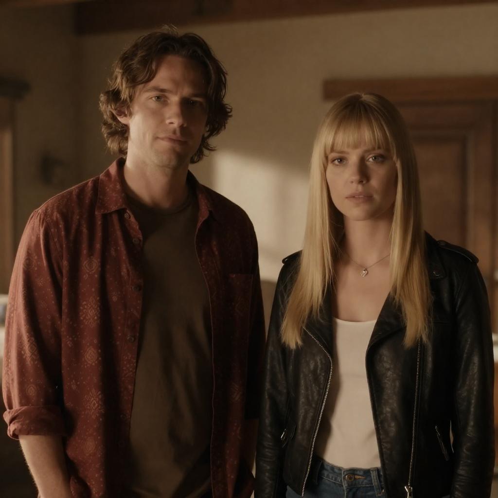 Photograph of a man and woman standing closely together. The man, with short dark hair and a beard, wears a dark pinstripe suit over a blue shirt. The blonde woman, with straight hair and bangs, wears a bright red long-sleeve top. She rests her hand on her pregnant belly. The background includes posters and a large portrait of a woman's face.