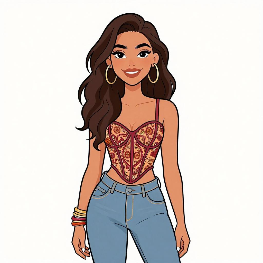 Woman with pretty face and pretty hair. smiling Woman, bohemian chic, black halter top with deep V-neck and embroidered trim, beaded accents, flowy silhouette, printed high-waisted shorts with geometric pattern, cuff bracelets, casual updo with loose strands, white studio background --sref 1467
